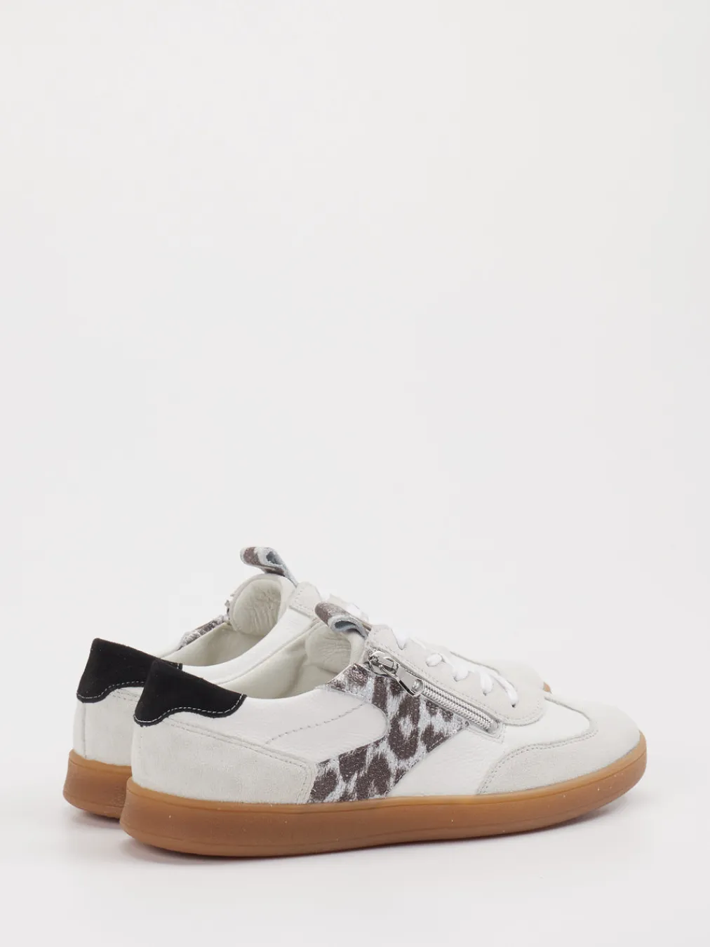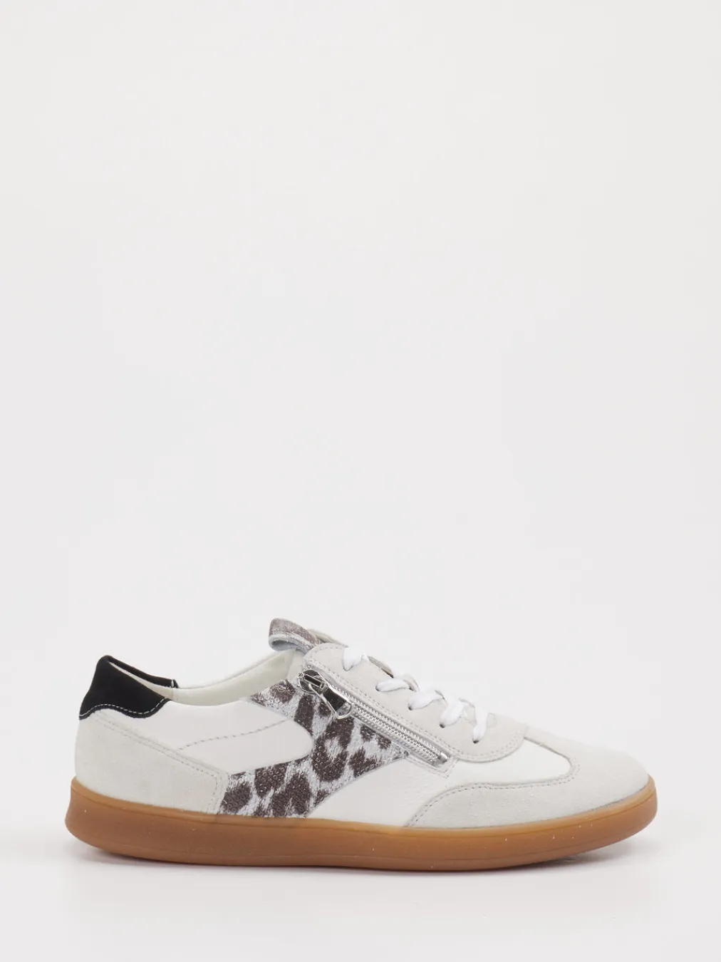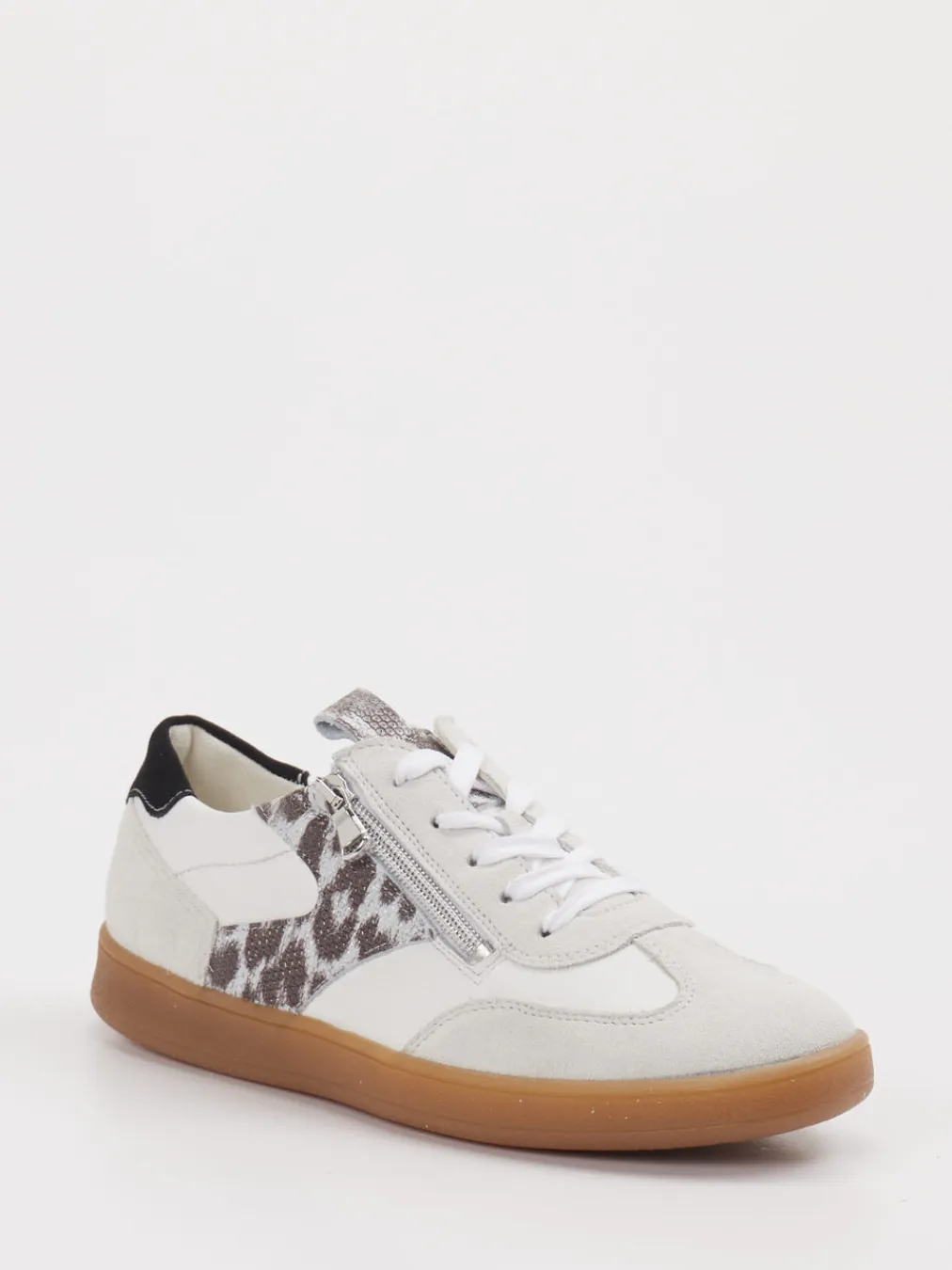 Ob für entspannte City-Ausflüge oder lange Spaziergänge – das Modell überzeugt durch sein Obermaterial aus Veloursleder mit glatter und rauer Oberfläche. Die weiße Grundfarbe wird durch graue und schwarze Details, eine kontrastierende Fersenkappe sowie einen Einsatz im Animal-Print ergänzt. Ein seitlicher Reißverschluss neben der Schnürung erleichtert das Anziehen. Die rutschhemmende Gummisohle und der gepolsterte Schaftrand sorgen für Stabilität und Wohlgefühl. Ein trendbewusster Look mit funktionalem Anspruch. Besonders gut kombinierbar mit hellen Jeans oder monochromen Outfits.