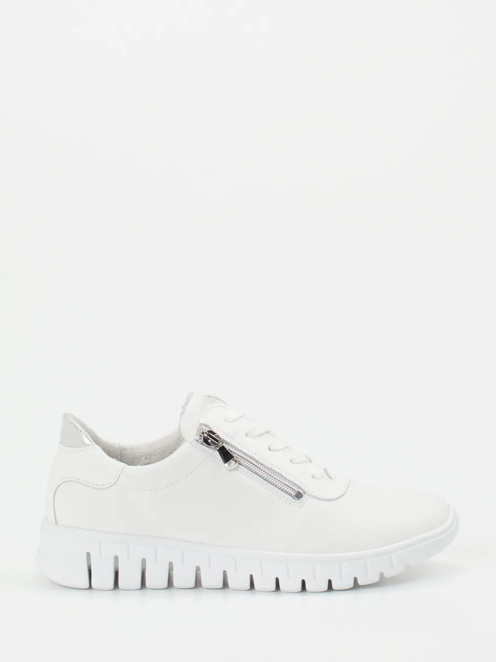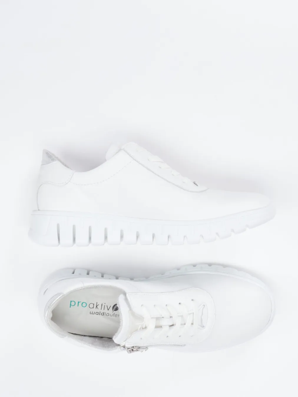Modisch präsentiert die Marke Waldläufer diesen Sneaker in der Form Birdy mit der Weite H. Das weiße Kalbleder wirkt durch die natürliche Narbung besonders sportiv. Ist die tonige Schnürung einmal individuell eingestellt, hilft der seitliche Reißverschluss beim einfachen Ein- und Ausstieg. Die wunderbar weiche Innenpolsterung, das saugfähige Frottee und das gepolsterte Wechselfußbett versprechen besten Tragekomfort. Die gut profilierte, angenehm leichte EVA-Sohle sorgt für Trittsicherheit.