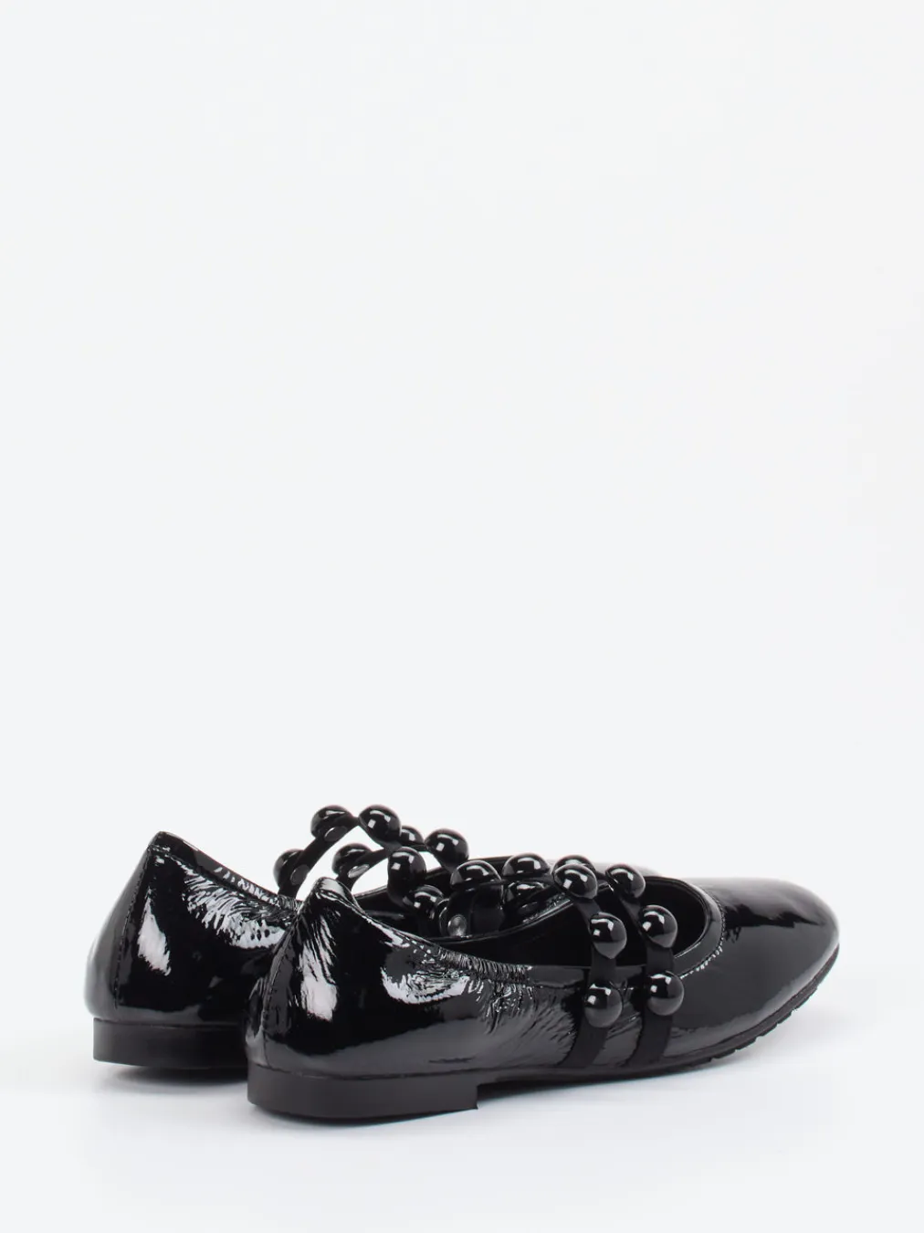 Der glänzende Spangenpumps überzeugt durch edles Lackleder, zarte Perlenakzente und eine flache Silhouette – ideal für stilbewusste Alltagslooks mit femininer Note.