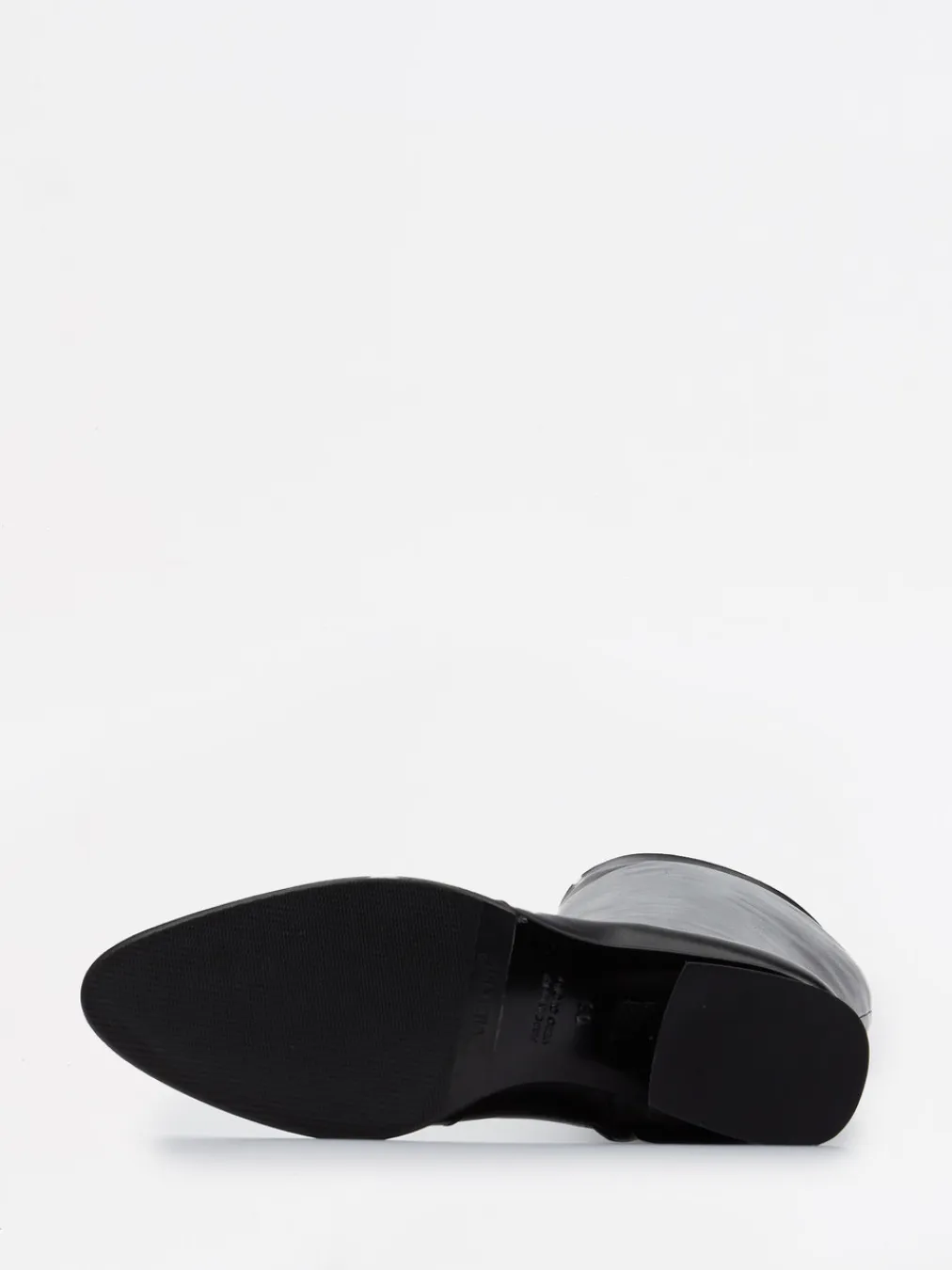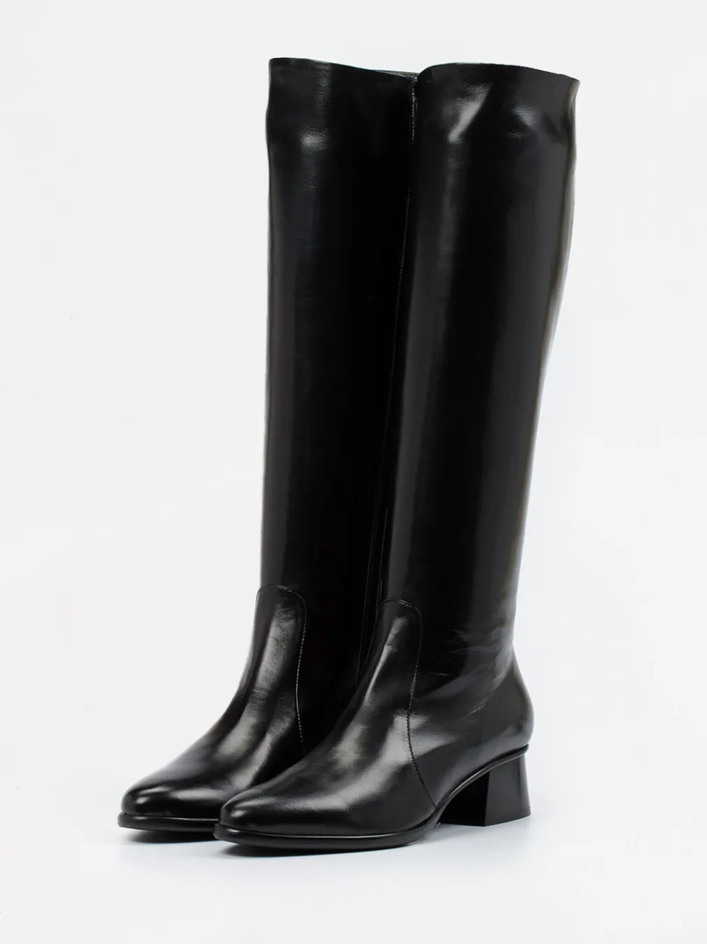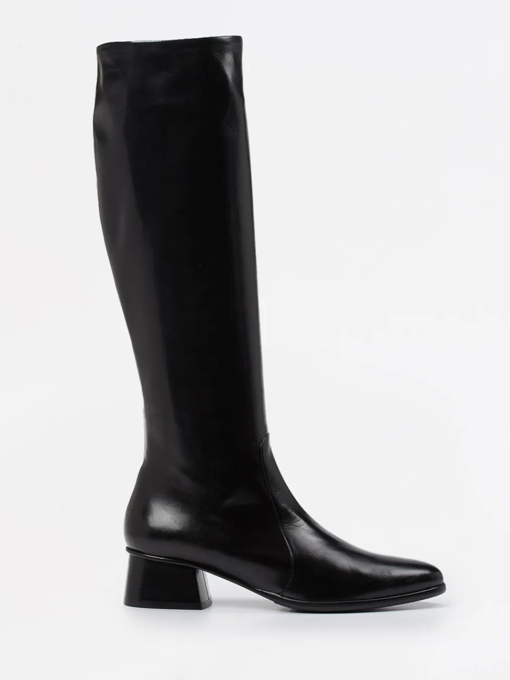 Schwarzes Lammnappaleder und eine klare Linienführung stehen bei diesem kniehohen Stiefel im Vordergrund. Minimalistisches Design trifft auf modernen Komfort.