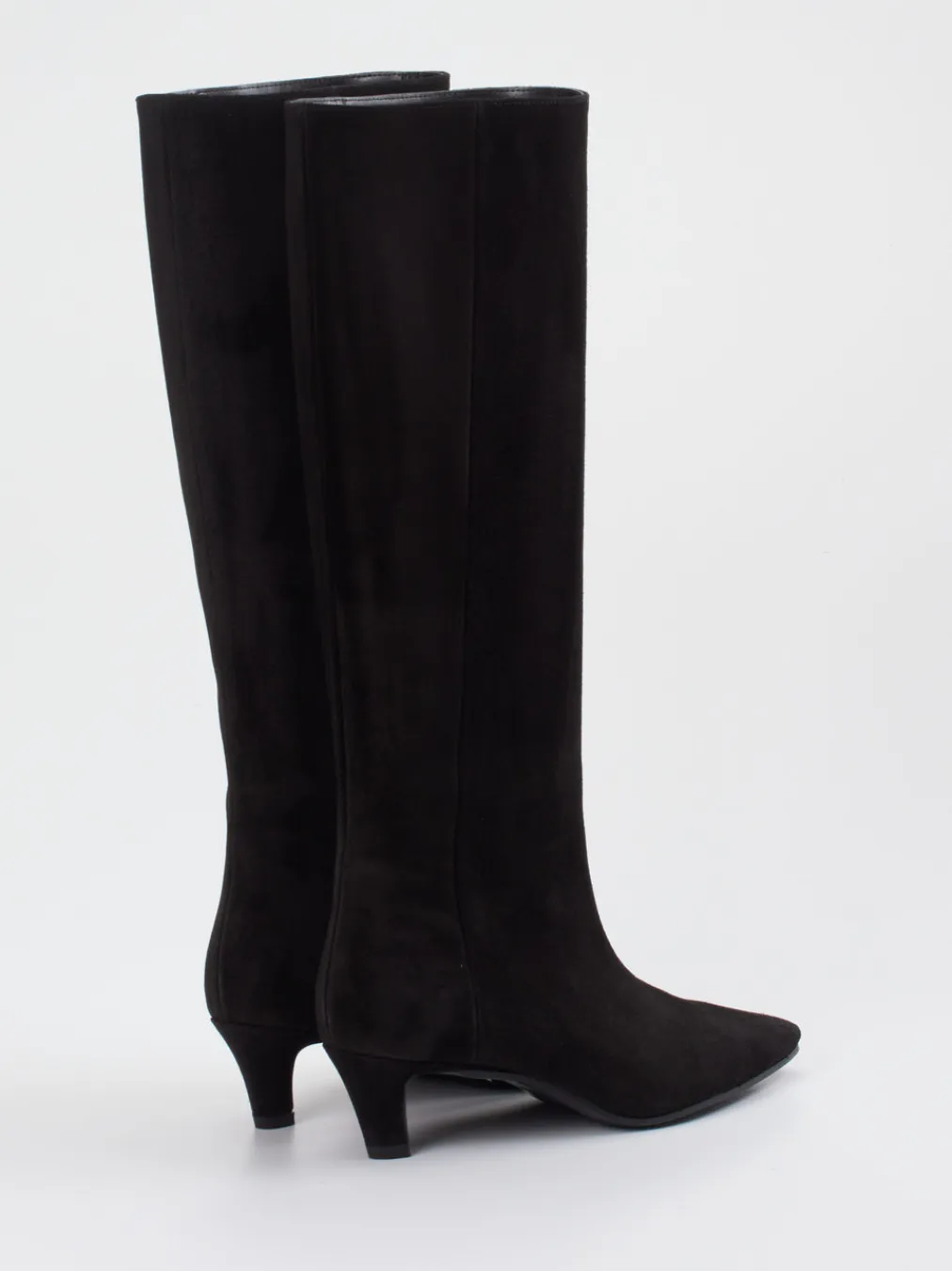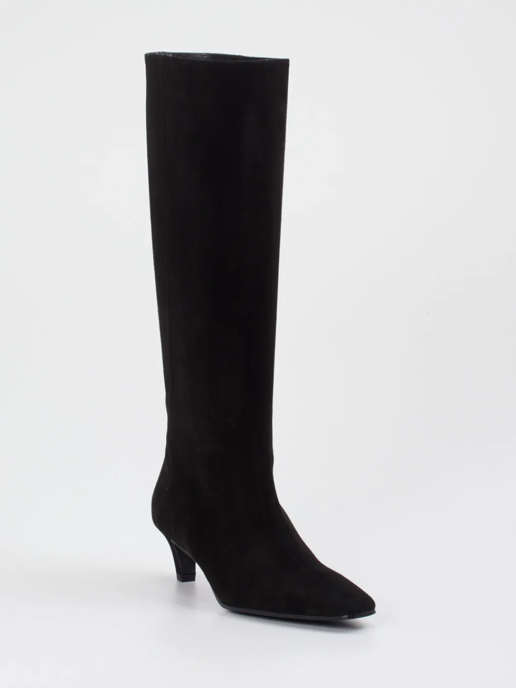 Schlichte Eleganz für jede Gelegenheit.Konstantin Starke präsentiert einen kniehohen Damenstiefel mit klarer Formsprache für modebewusste Alltags- und Businessmomente. Gefertigt aus hochwertigem, matt strukturiertem Veloursleder in tiefem Schwarz, überzeugt er mit schmaler, gerader Silhouette und einem femininen Kitten Heel von 5 cm Höhe. Ton-in-Ton-Nähte und eine spitz zulaufende Kappe verleihen dem Modell eine puristische Ausstrahlung. Das komfortable Lederimitatfutter und die robuste Gummisohle sorgen für angenehmes Tragen im Alltag. Stilistisch inspiriert vom Minimalismus der 90er trifft der Stiefel den aktuellen Quiet Luxury Trend. Ideal kombinierbar mit Midikleidern oder schmalen Hosen – ein zeitloses Statement mit der Handschrift von Konstantin Starke.
