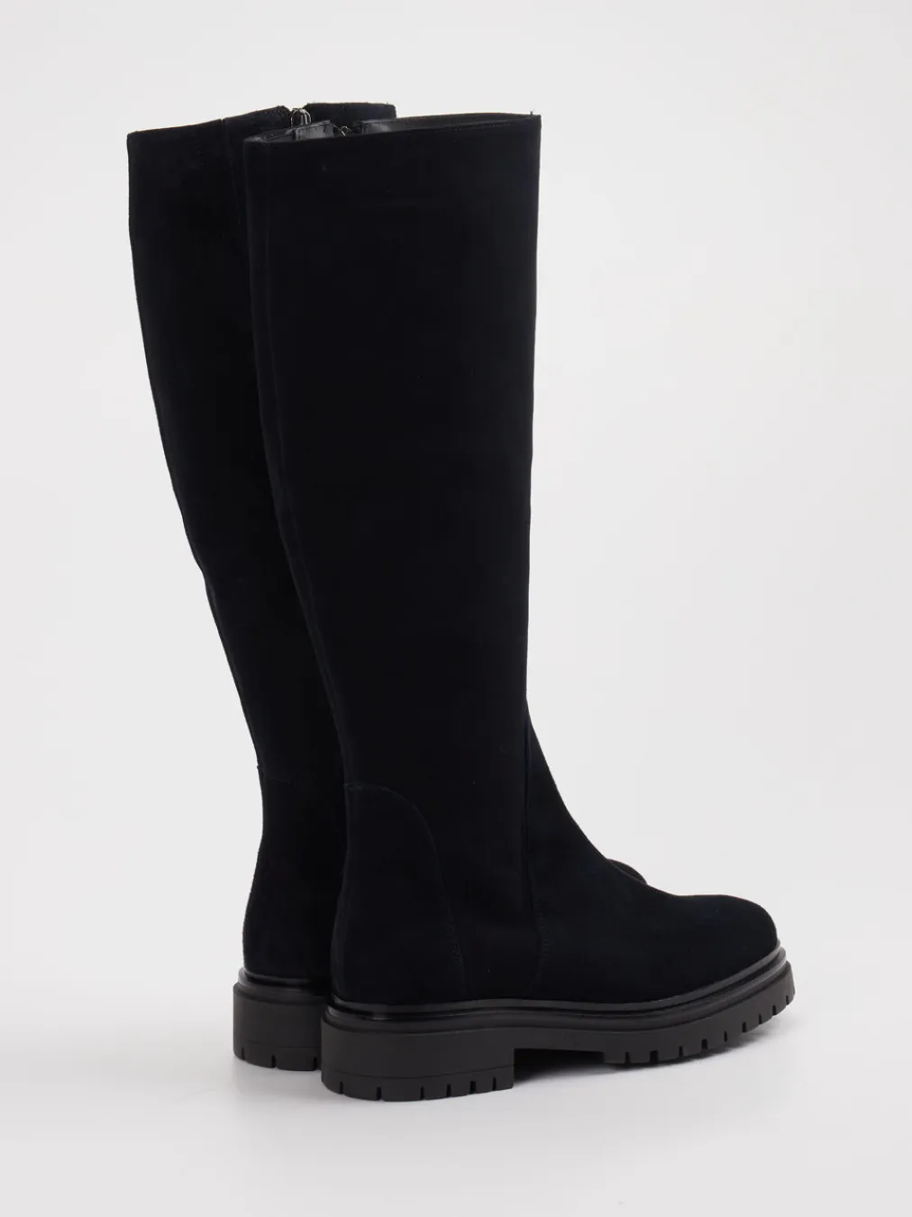 Geradliniges Design, schwarzes Veloursleder und eine robuste Profilsohle machen diesen kniehohen Stiefel zu einem urbanen Essential der neuen Saison.