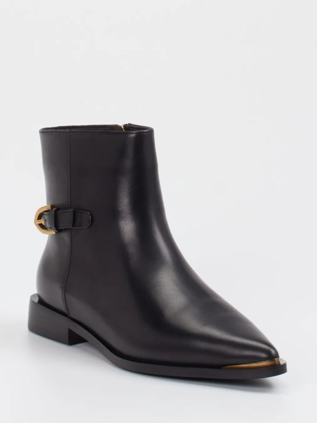 Ideal für anspruchsvolle Alltagssituationen, überzeugt das Modell durch hochwertiges, glänzendes Glattleder mit goldfarbenem Metallbesatz an der Spitze. Die spitz zulaufende Front und eine goldene Zierschnalle unterstreichen das elegante Design. Ein seitlicher Reißverschluss sorgt für Komfort, während die Gummisohle Alltagstauglichkeit verspricht. Die zurückhaltend-klassische Silhouette trifft moderne Trends wie „Quiet Luxury“.