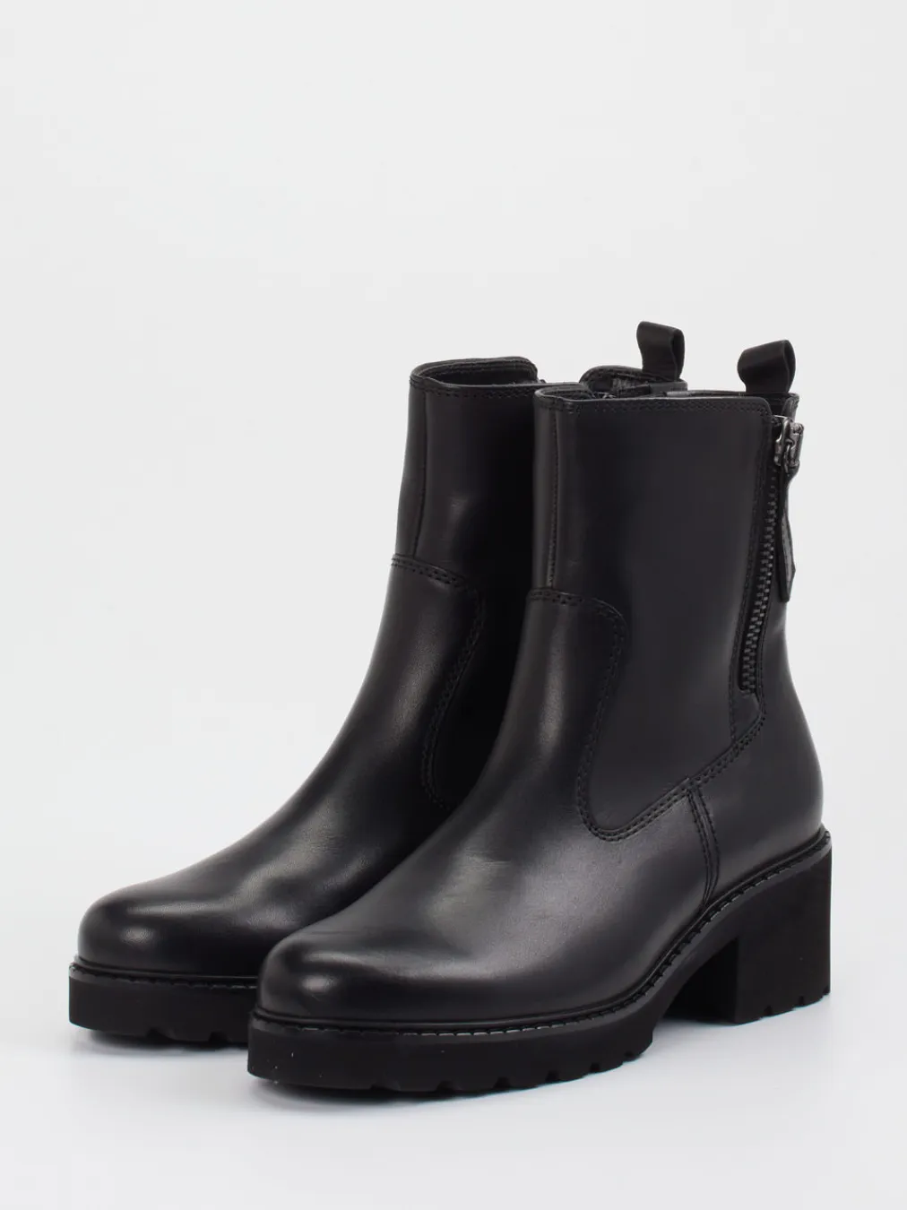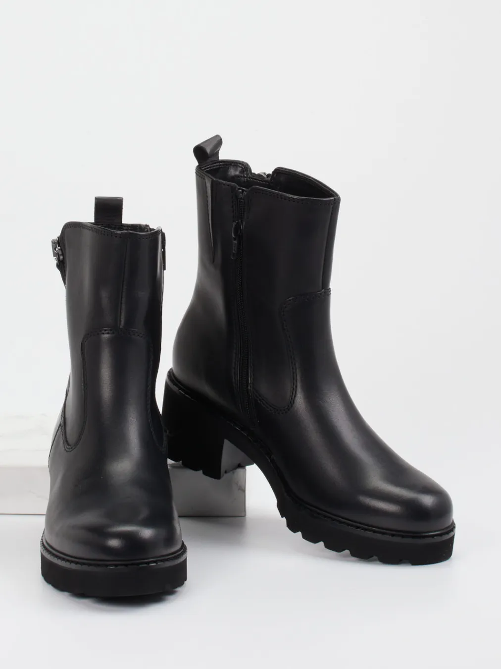 Diese Stiefelette kombiniert hochwertiges Kalbleder mit urbaner Silhouette und robuster Profilsohle – ideal für minimalistische Looks mit Komfortanspruch.