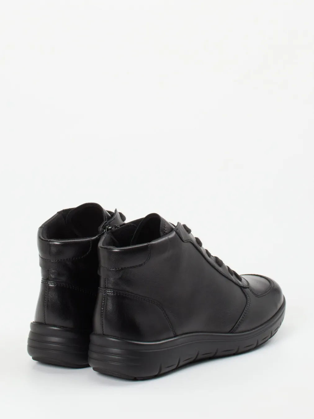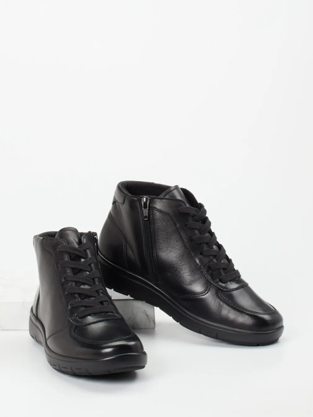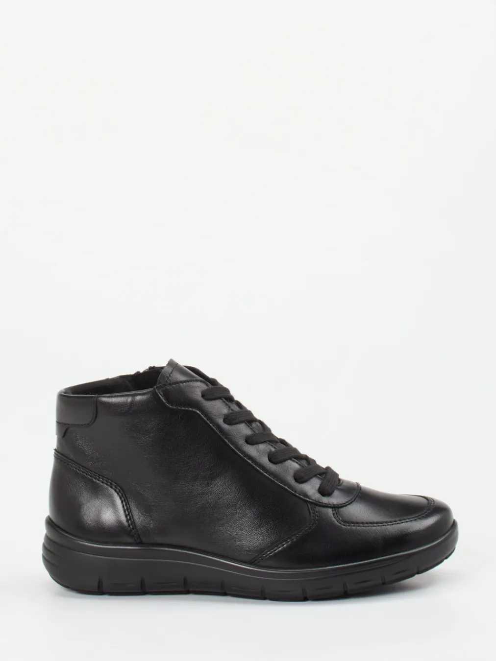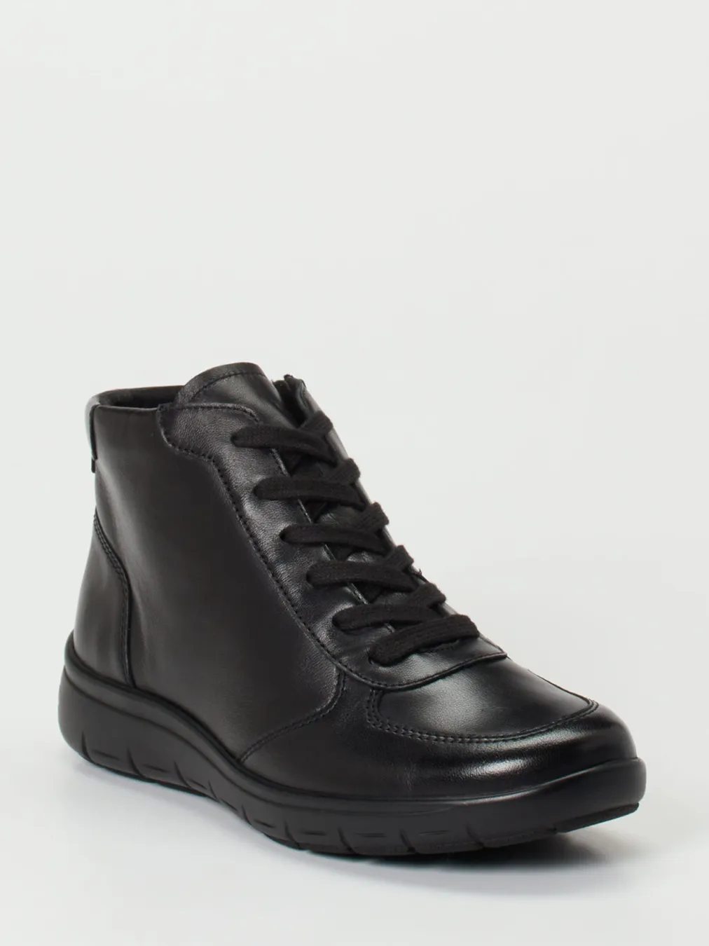 Minimalismus trifft Komfort.Semler präsentiert eine komfortbetonte Damen-Stiefelette für Alltag und Freizeit. Weiches schwarzes Kalbleder mit seidigem Glanz prägt das Design dieser knöchelhohen, sportlich-kompakten Schnürstiefelette. Eine Kombination aus Schnürung und innenliegendem Reißverschluss erleichtert das An- und Ausziehen. Das Innenfutter aus weichem Textil sowie das gepolsterte, austauschbare Fußbett sorgen für angenehmes Tragegefühl. Die profilierte PU-Luftpolstersohle mit integrierter Dämpfung unterstützt ein ermüdungsfreies Gehen – auch auf längeren Strecken. Dezente Ton-in-Ton-Nähte und das puristische Erscheinungsbild passen ideal zum Quiet-Utility-Look. Semler vereint orthopädischen Anspruch mit stilistischer Zurückhaltung und Qualität.
