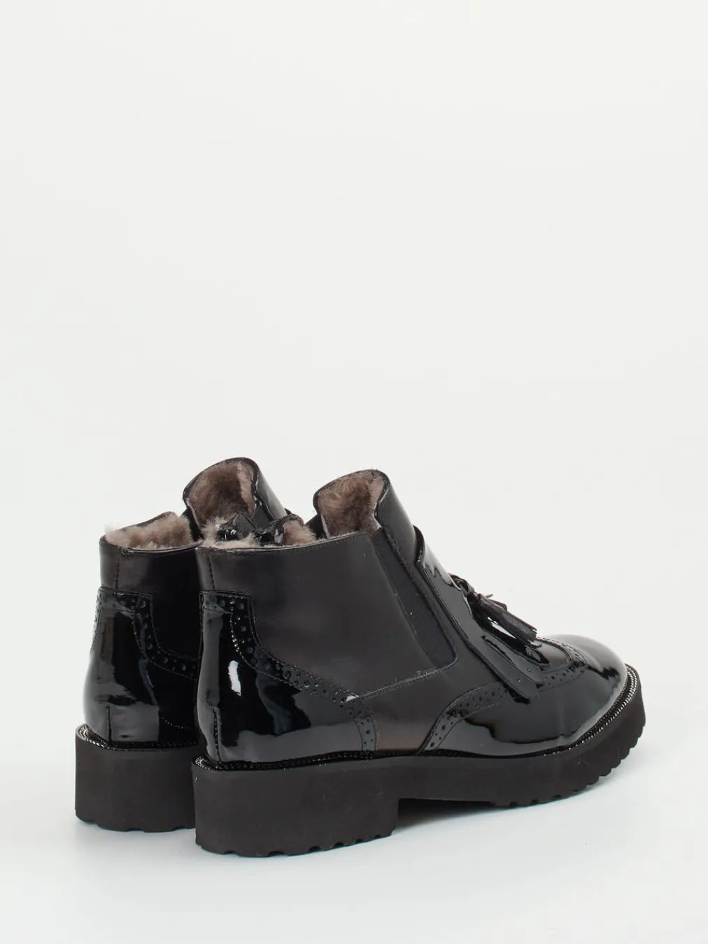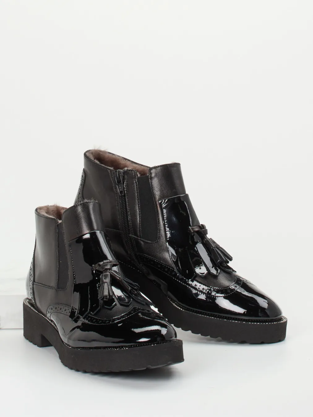 Diese elegante Stiefelette verbindet glänzendes Lackleder mit klassischem Broguing und modernem Tassel-Design – ein stilvoller Begleiter für Wintertage in Büro und Alltag.