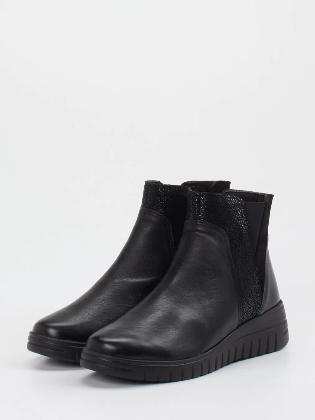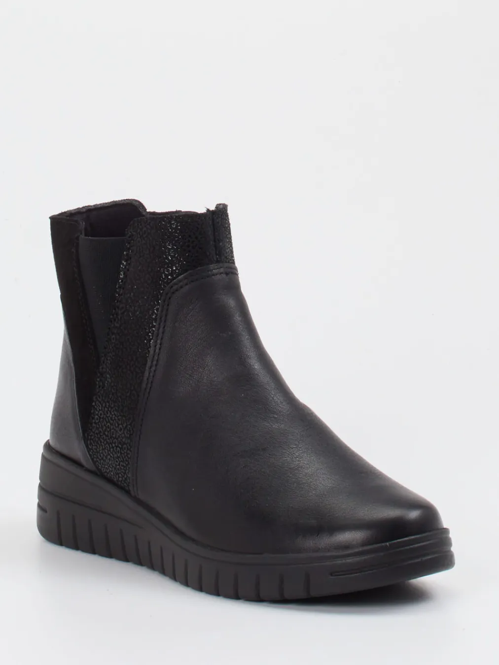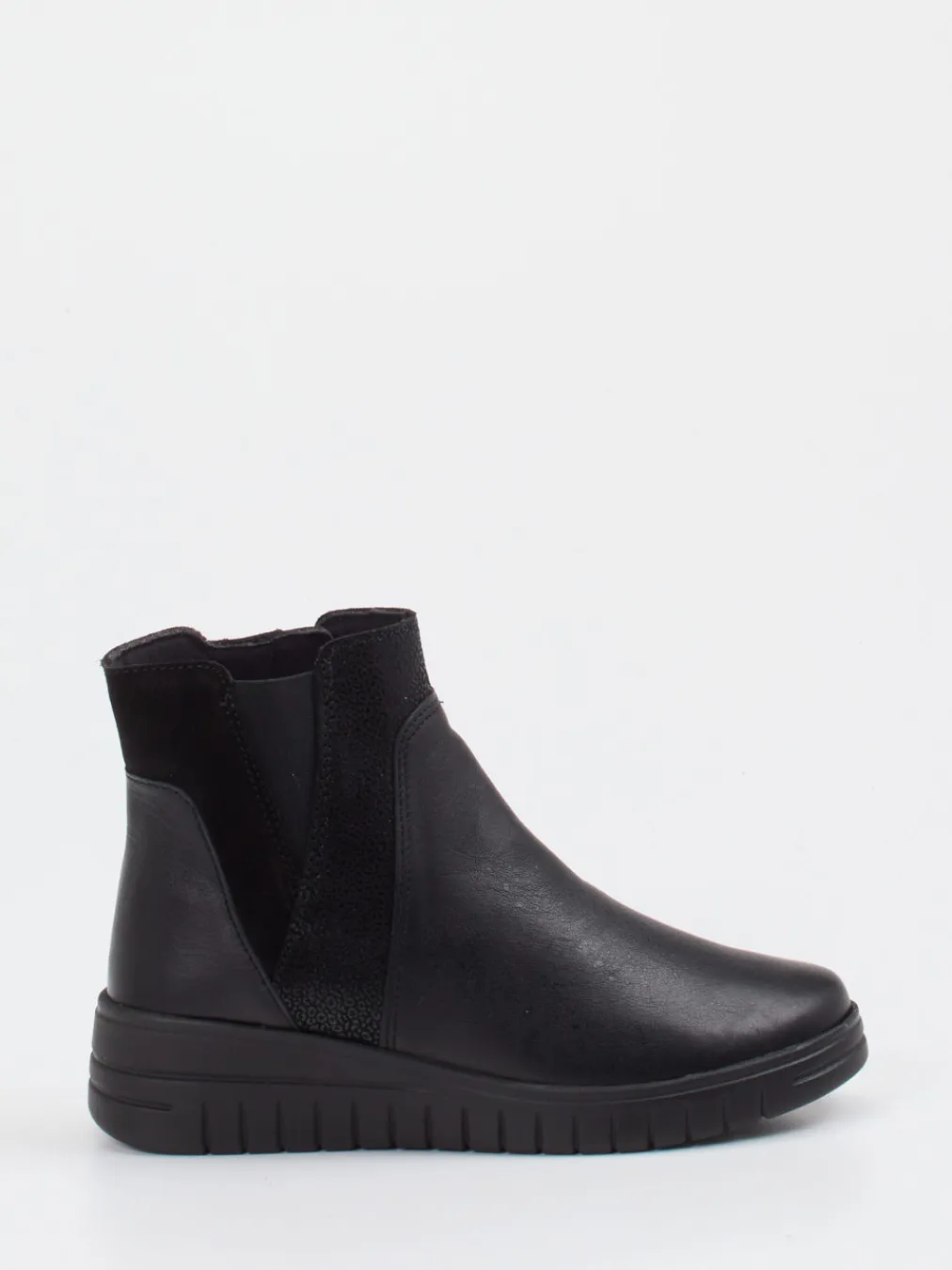 Komfort trifft minimalistischen Chic.Cypres Soft präsentiert eine Damen-Stiefelette aus feinem Kalbleder für Alltag und Beruf. Die knöchelhohe Form mit rund zulaufender Silhouette sowie Elastikeinsatz und Reißverschluss bieten hohen Tragekomfort. Das matte, schwarze Leder wird seitlich von einem tonalen Struktur-Detail akzentuiert. Eine weiche Gummisohle mit Profil sorgt für Grip und unterstützt das Komfortkonzept. Dezente Prägung und die schlichte Optik positionieren das Modell im Stilfeld von Quiet Luxury und Comfort Core. Besonders gut kombinierbar mit schmalen Hosen und cleanen Oberteilen. Cypres Soft steht für durchdachte Passform mit stilvollem Understatement.