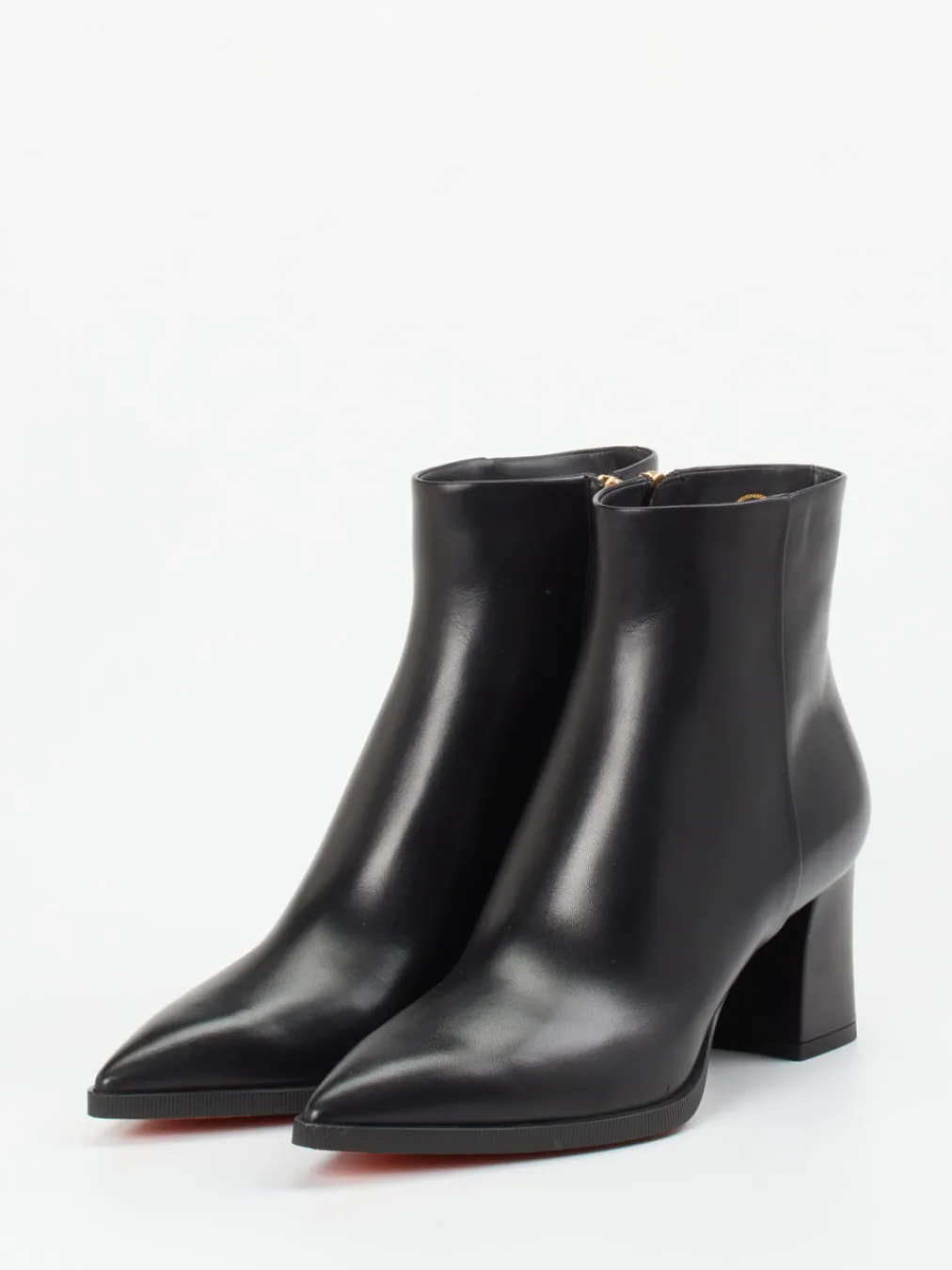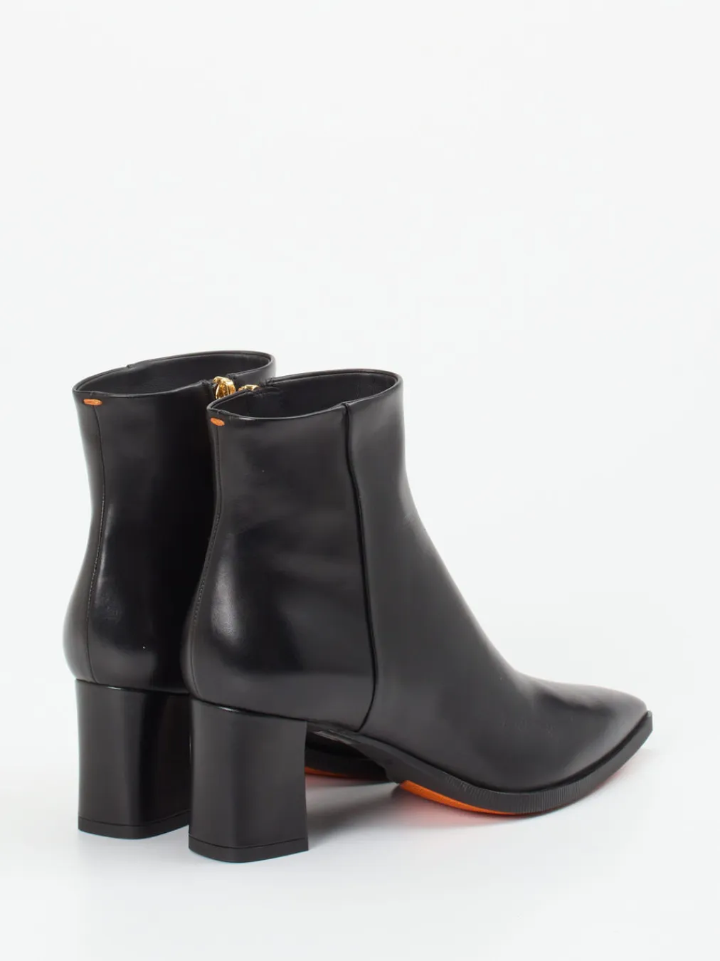 Schwarzes Kalbleder mit zartem Glanz, kombiniert mit femininer Silhouette und goldfarbenem Reißverschluss – diese Santoni-Stiefelette interpretiert modernen Chic mit anspruchsvoller Handwerkskunst.