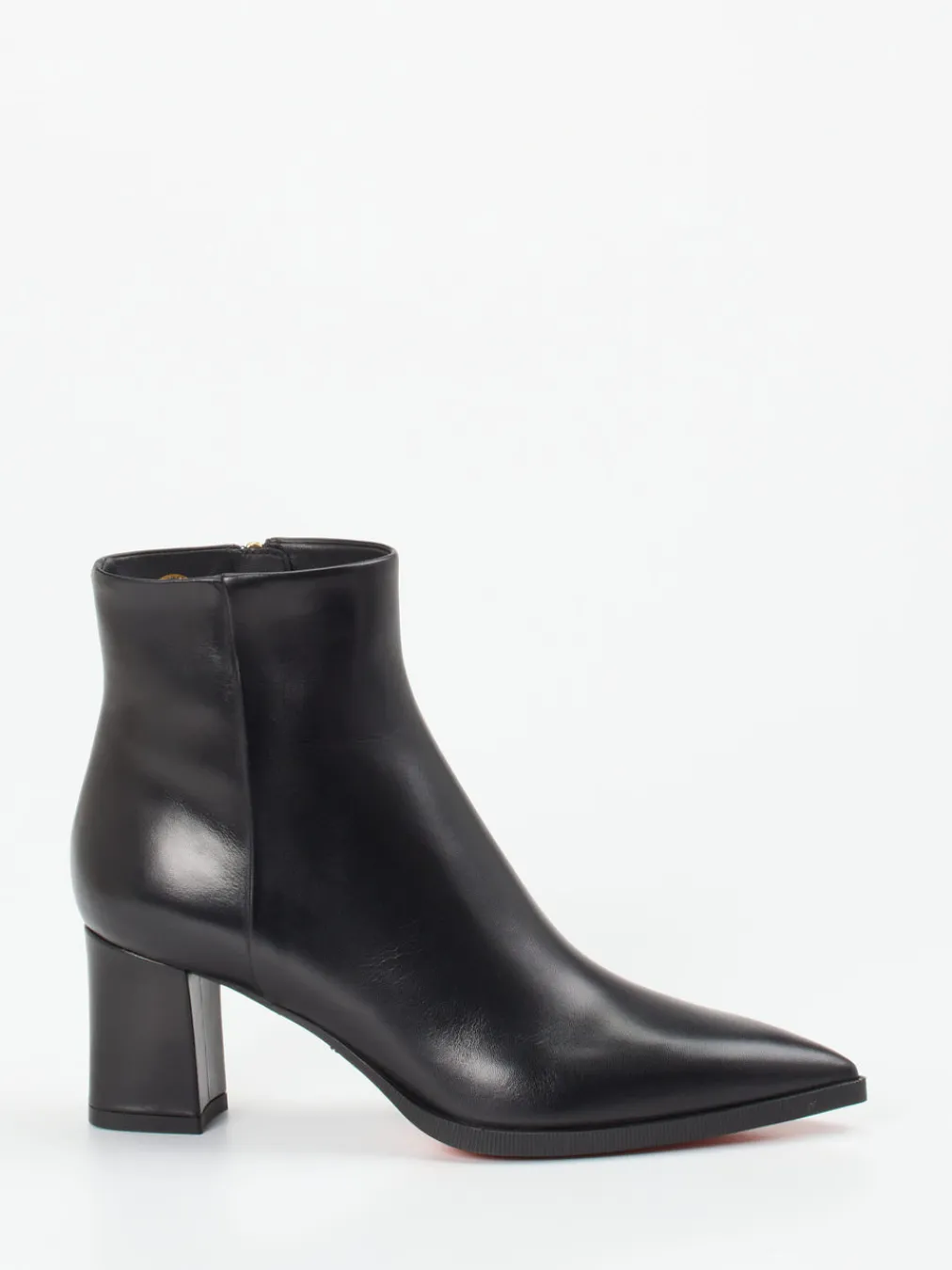 Eleganz für Tag und Abend.Die italienische Marke Santoni präsentiert mit dieser Damen-Stiefelette einen stilvollen Allrounder für Büro und Abendgarderobe. Gefertigt aus feinem, glänzendem Kalbleder und ausgestattet mit einem spitz zulaufenden Leisten, strahlt das Modell klare Linienführung und Minimalismus aus. Ein goldfarbener Reißverschluss sorgt für edlen Kontrast und erleichtert den Einstieg. Die knöchelhohe Silhouette mit 5 cm hohem Blockabsatz verleiht Standfestigkeit bei femininer Anmutung. Innen überzeugt glattes Kalblederfutter mit Komfort, während die Gummisohle im markentypischen Orangeton formschön abschließt. Ein Paradebeispiel für „Quiet Luxury“ – ideale Ergänzung zu Wollmantel, Seidenbluse oder Ledertasche. Santoni verbindet modernes Design mit meisterhafter Lederverarbeitung.