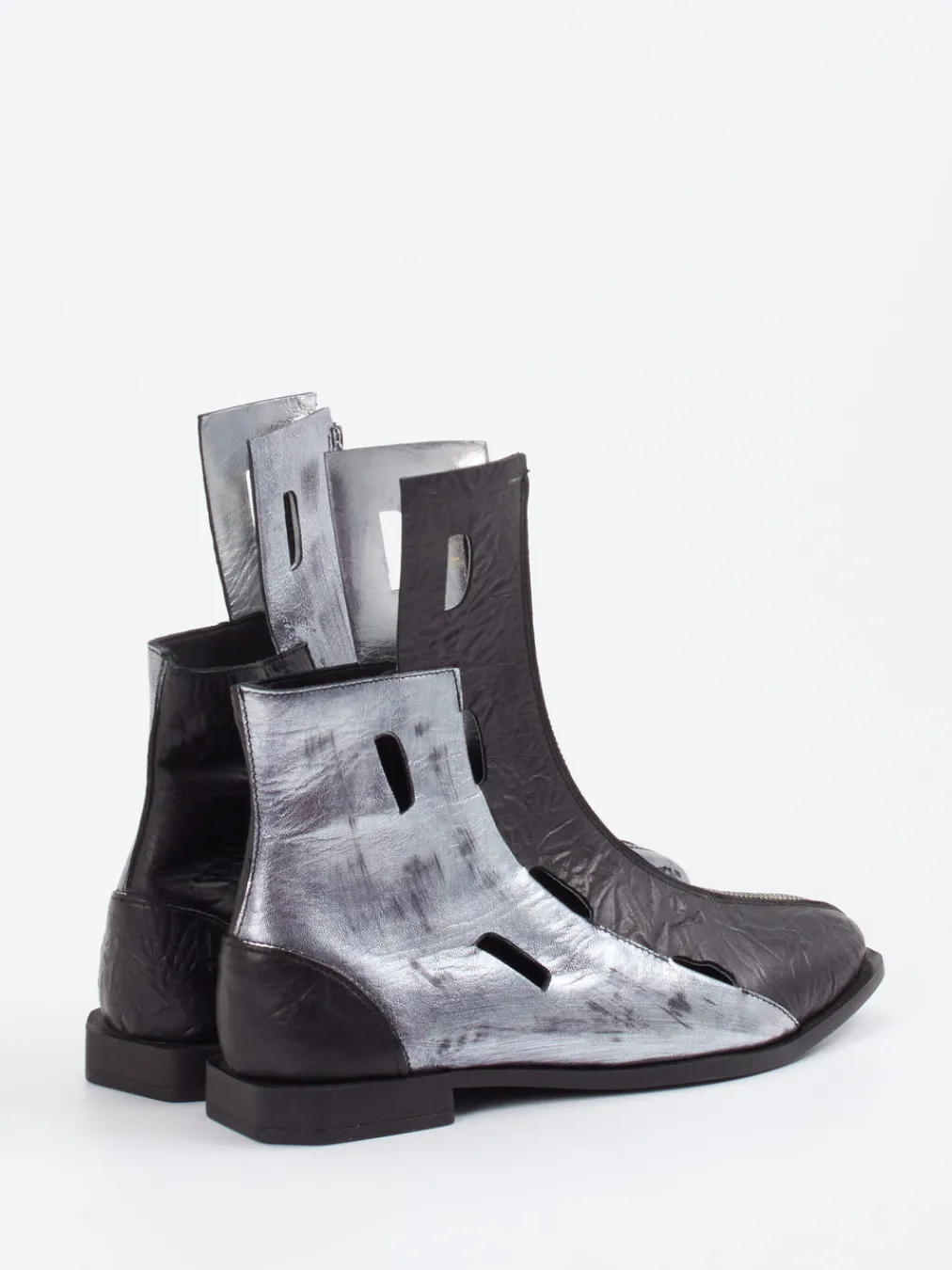 Die modische Papucei-Stiefelette kombiniert strukturiertes Glattleder in Schwarz mit silberfarbenem Metallicleder und präsentiert sich mit mutigem Cut-Out-Design und zentralem Frontreißverschluss.