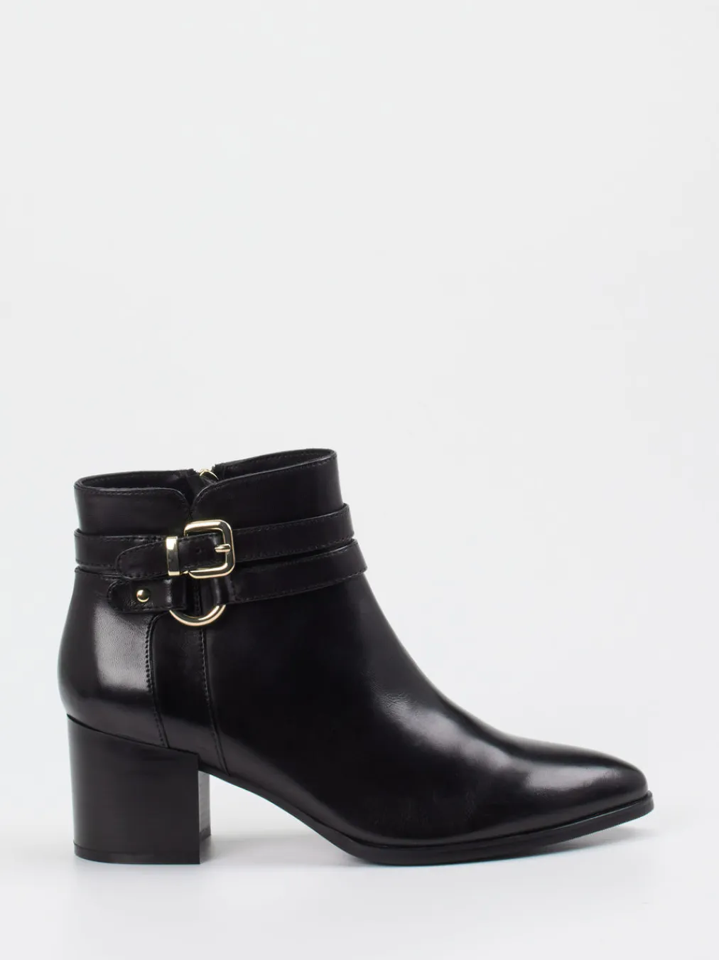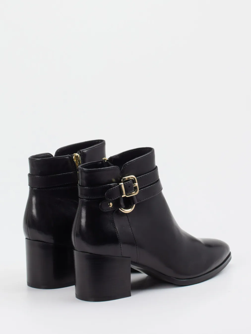 Reduktion trifft Raffinesse.Die Marke Ralph Harrison zeigt mit dieser Stiefelette eine klassische Interpretation moderner Ankle Boots. Glänzendes, schwarzes Kalbleder und eine goldfarbene Zierschnalle verleihen dem Modell eine stilvolle Note – passend für Büro und Freizeit. Der knöchelhohe Schnitt wird durch einen dezenten Reißverschluss ergänzt, während die profilierte Gummisohle sicheren Tritt bietet. Feine Ton-in-Ton-Nähte und ein 5,5 cm hoher Blockabsatz runden das cleane Design ab. Der Look verkörpert den Trend „Quiet Luxury“ mit minimalistischer Eleganz. Ideal kombinierbar zu Wollmantel oder Lederhandtasche. Ein stilvoller Begleiter mit makelloser Linienführung und hochwertiger Verarbeitung.
