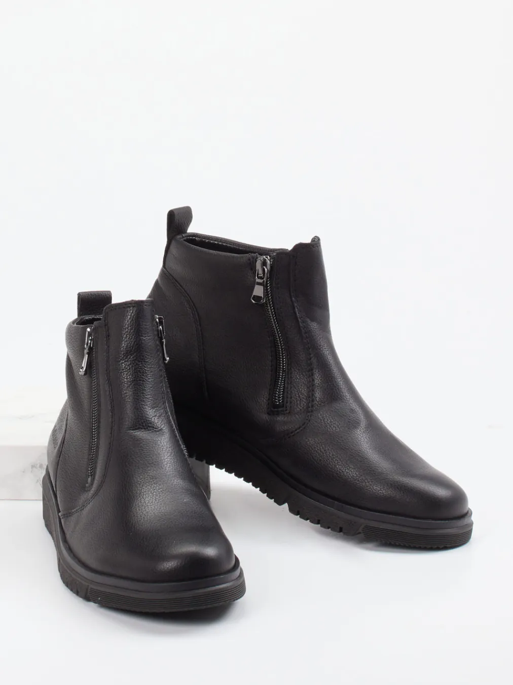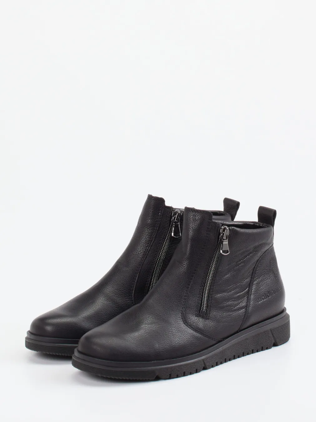 Komfortabel durch Herbst und Winter.Die Marke Waldläufer präsentiert eine moderne Komfort-Stiefelette für Damen. Ob beim Stadtbummel oder auf dem Weg zur Arbeit – diese knöchelhohe Stiefelette erfüllt den Wunsch nach bequemer Alltagstauglichkeit. Das schwarze Kalbleder ist leicht genarbt und zeigt sich robust und anschmiegsam. Beidseitige, silberfarbene Reißverschlüsse erleichtern das An- und Ausziehen, während die rutschhemmende Gummisohle einen sicheren Tritt bietet. Die rund zulaufende Form und die dezente Zuglasche setzen funktionale Akzente. Der Look passt perfekt zu schmalen Hosen und Wollmänteln. Waldläufer verbindet spürbaren Komfort mit klarer Silhouette – ideal für entspannte, stilvolle Wege.