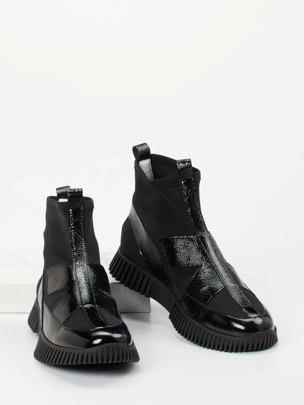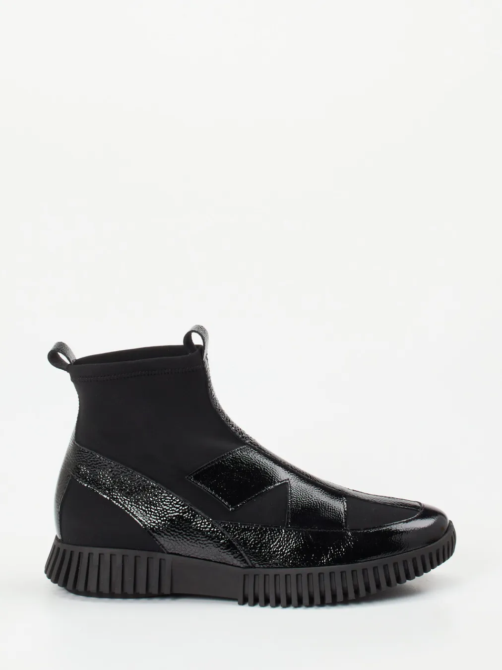 Minimalistisches Statement in Schwarz.Die Marke Arche präsentiert mit dieser Stiefelette eine gelungene Symbiose aus Techno-Ästhetik und Streetstyle. Ideal für urbane Tage, verbinden sich schwarzes Lackleder mit samtartigem Stretchtextil zu einem nahtlosen Gesamtbild. Die knöchelhohe, sockenartige Silhouette passt sich flexibel an, eine strukturierte Gummisohle mit Riffelprofil bietet stabilen Halt. Zuglaschen vorn und hinten setzen sportliche Akzente, während der Gesamtlook von einem puristischen Schwarzton dominiert wird. Die Kollektion spielt auf Trends wie „All Black Everything“ und „Techno Texture AW24“ an und eignet sich perfekt zu Oversized-Silhouetten oder monochromen Styles. Ein Design mit Komfortversprechen – Arche vereint Leichtigkeit, Passform und modische Eigenständigkeit.