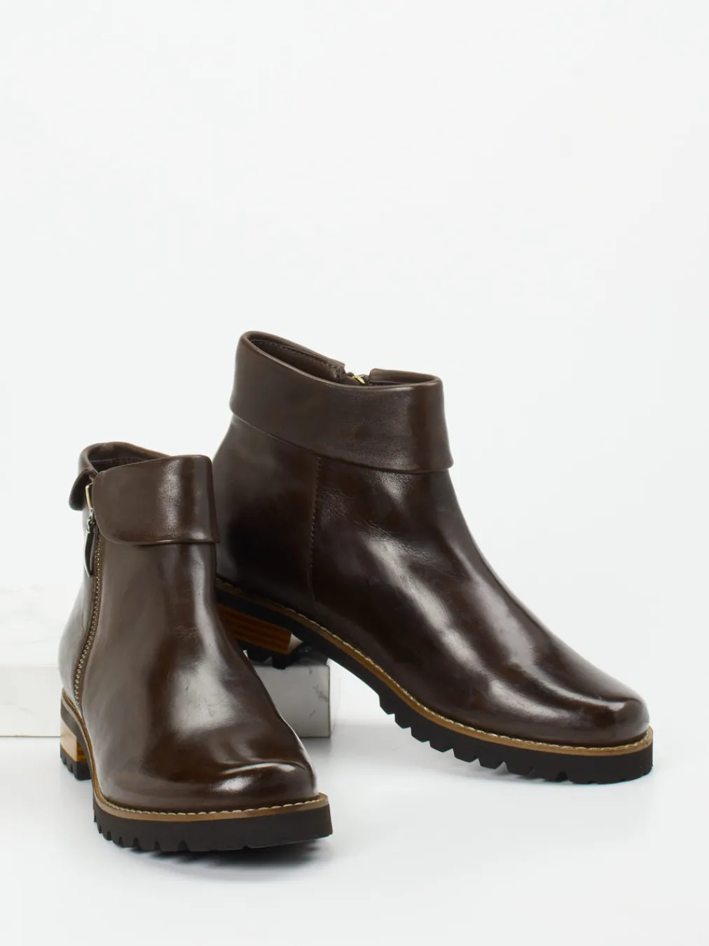 Diese klassisch-eleganten Stiefeletten aus kastanienbraunem Lammleder vereinen weichen Tragekomfort mit urbaner Funktionalität und modischer Silhouette.