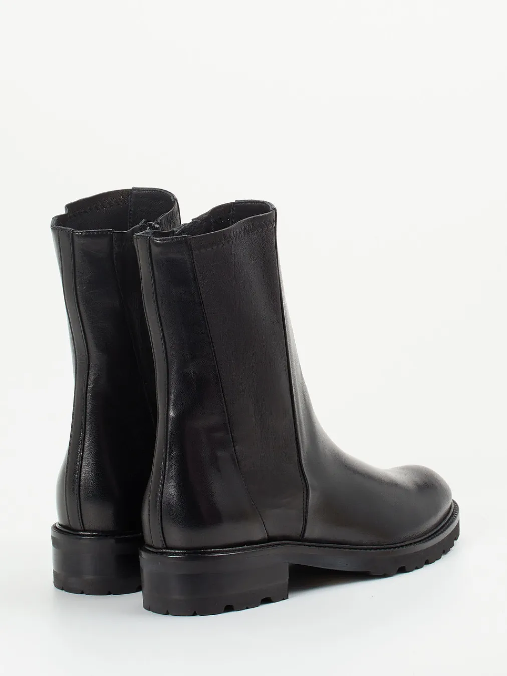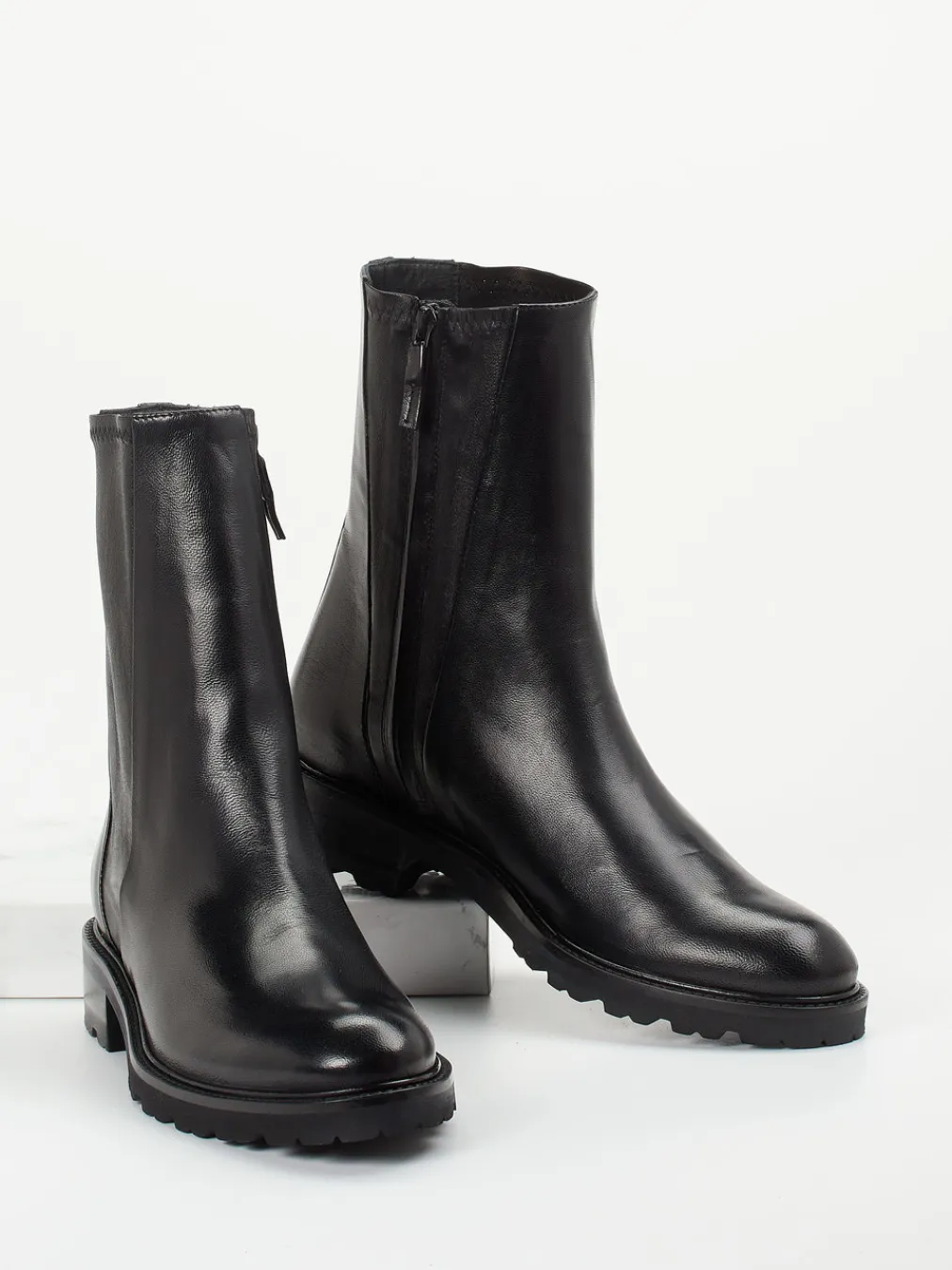 Diese eleganten Damen-Stiefeletten vereinen glänzendes Lammleder mit klarer Linienführung und zeitloser Farbgebung – ideal für urbane Looks mit minimalistischem Anspruch.