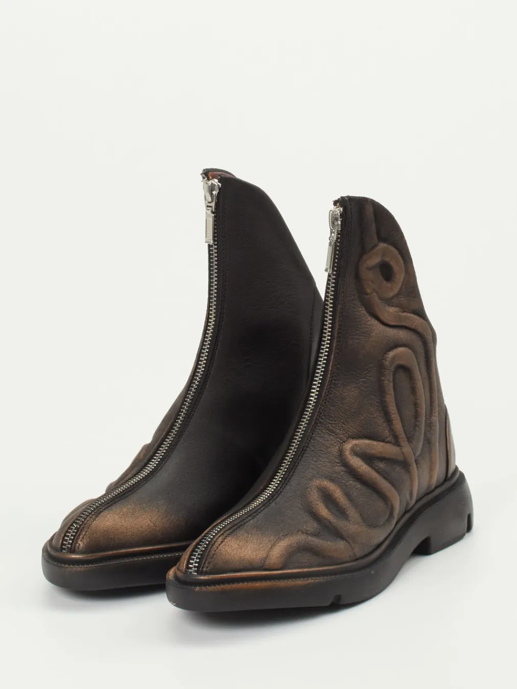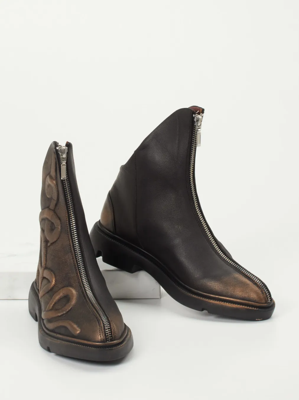 Diese Stiefelette vereint avantgardistisches Design mit hochwertigem Kalbleder – ein Statement-Piece mit skulpturaler Formensprache und metallic-schimmernder Oberfläche.