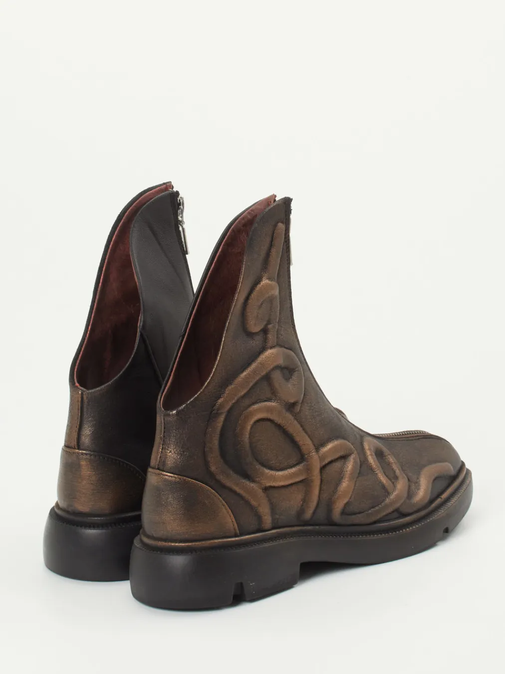 Statement für individuelle Looks.Papucei interpretiert die klassische Stiefelette neu und kreiert ein Modell mit skulpturalem Anspruch. Für urbane Szenen oder außergewöhnliche Alltagsmomente – diese hochgeschlossene Stiefelette überzeugt mit weichem, metallic veredeltem Kalbleder in Bronzebraun. Die strukturierte Oberfläche mit kupferfarbenem Reliefmuster, die asymmetrische Schafthöhe und der mittig platzierte Reißverschluss verleihen ihr einen progressiven Look. Die profilierte Gummisohle und das weinrot ausgekleidete Innenfutter aus Kalbleder bieten Komfort trotz markanter Form. Inspiriert vom „Sculptural Footwear“-Trend ist dieser Schuh wie gemacht für expressive Stylings mit Oversized-Silhouetten oder Metallic-Accessoires. Ein Design-Highlight mit urbaner Klarheit – kompromisslos kreativ.