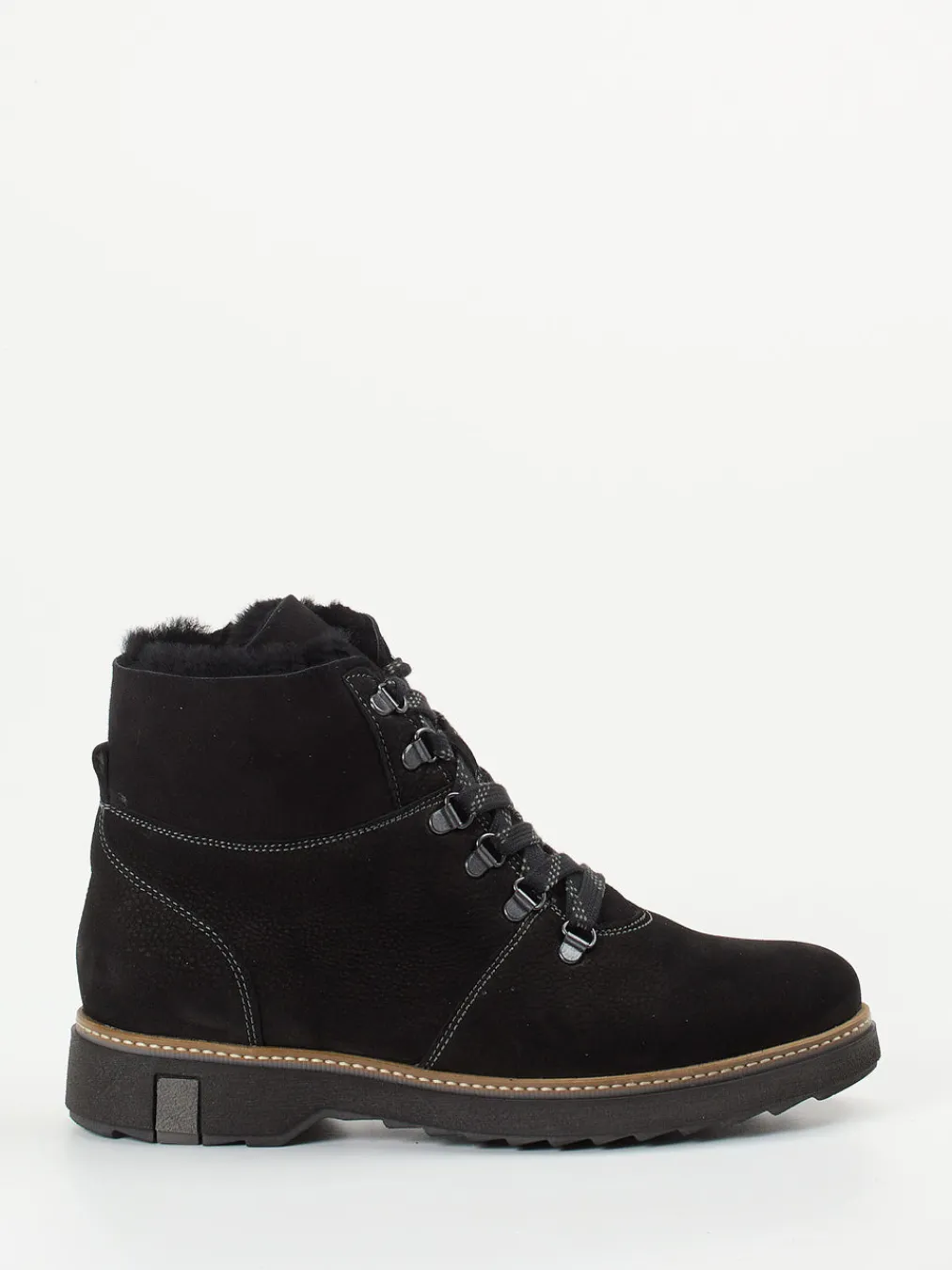 Perfekt für winterliche Stadtspaziergänge bietet die Schnürstiefelette eine weite H-Passform und ökologische Funktionalität. Gefertigt aus fein genarbtem Nubukleder, ergänzt durch samtige Haptik, trifft das schwarze Obermaterial auf dekorative Kontrastnähte und robuste Metallösen. Das kuschelige Innenfutter in Fell-Optik sorgt für wohlige Wärme, während der praktische Reißverschluss das Anziehen erleichtert. Die profilstarke Gummisohle gibt sicheren Halt auf rutschigen Wegen. In Schwarz mit handwerklichem Rahmen setzt sie ein dezentes Fashion-Statement im Utility-Stil – ganz im Sinne modernen Quiet Luxurys.