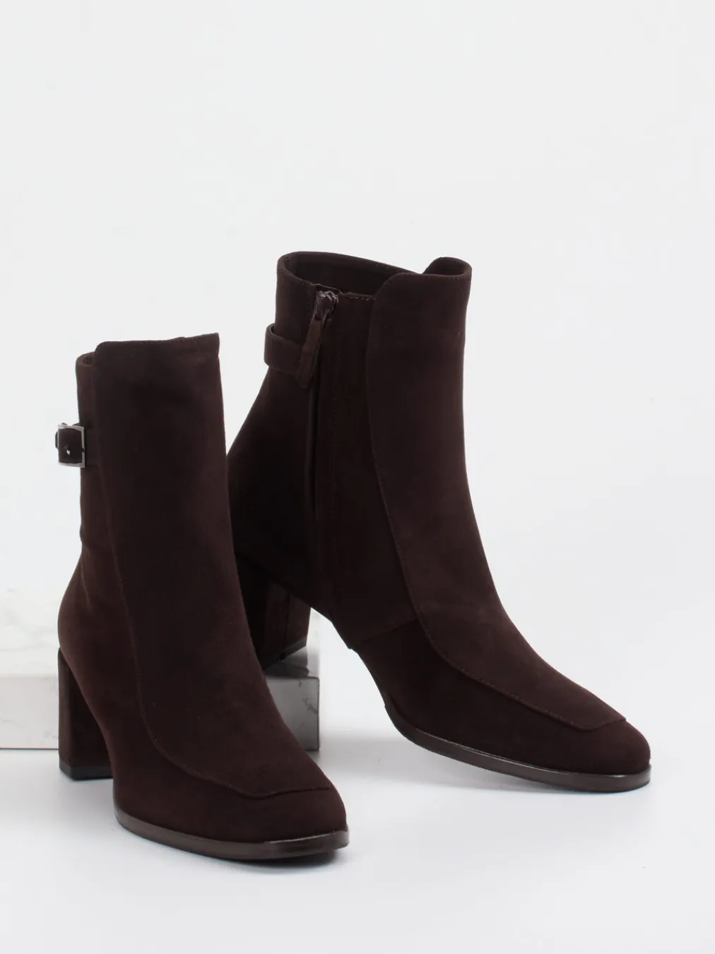 Eleganz trifft Understatement.Die Marke Konstantin Starke präsentiert mit dieser Stiefelette ein ausdrucksstarkes Damenmodell für den gehobenen Alltag. Ideal für Tage voller Termine ist das Modell dank 5,5 cm hohem Blockabsatz und 0,5 cm Plateau angenehm zu tragen. Veloursleder in Dunkelbraun, samtig mattiert, verleiht der klassisch-knöchelhohen Silhouette im Retro-Stil subtile Raffinesse. Ein seitlicher Reißverschluss und die dunkle Metall-Schnalle an der Ferse ergänzen die hochwertige Verarbeitung. Innen sorgt Kalbleder für Komfort, die halbierte Gummi-/Ledersohle für sicheren Tritt. Im Stilfeld „Quiet Luxury“ angesiedelt, passt dieser Schuh mühelos zu Wollmantel oder Business-Outfit. Ein vielseitiger Herbstfavorit mit handwerklicher Klasse.
