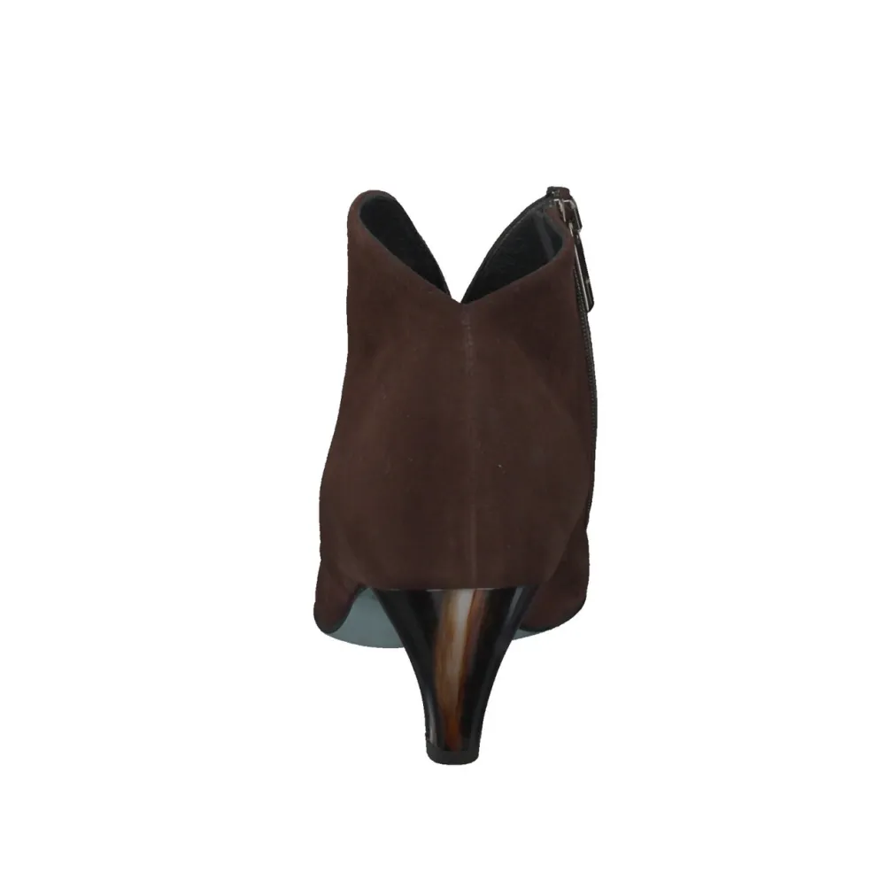 Eleganz und Modernität strahlt diese Reißverschlussstiefelette der Marke Thierry Rabotin aus. Das samtweiche, dunkelbraune Veloursleder kommt durch die schöne Linienführung mit dem geschwungenen Schaftabschluss und dem kleinen V-Ausschnitt stilvoll zur Geltung. In einem modischen Kontrast steht der schwarze Absatz mit den braun-weißen Farbakzenten in der Optik von Pinselstrichen. Durch die abgerundete, sich verjüngende Form fügt er sich stimmig in die feminine Silhouette der Stiefelette ein. Die hochwertige Verarbeitung unterstreicht die flexible Ledersohle mit der Gummiintarsie.