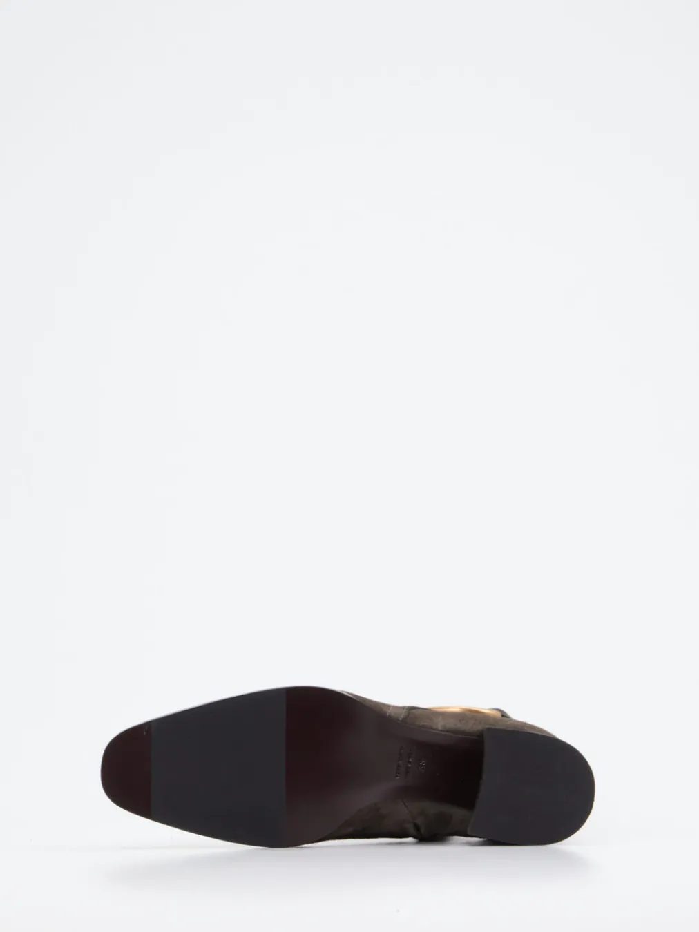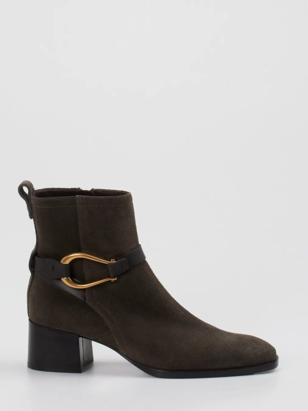 Die klassische Stiefelette aus edlem Veloursleder in Dunkeloliv überzeugt mit goldfarbener Metallschließe und reduziertem Design – ein stilbewusster Begleiter für moderne Herbst-Looks.