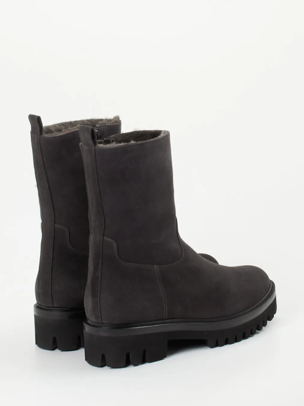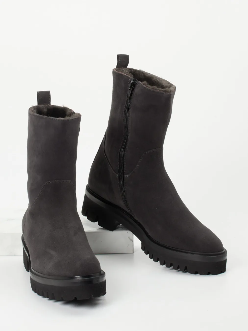 Robust. Minimalistisch. Wintertauglich.Truman’s interpretiert die klassische Winter-Stiefelette für Damen neu. Für kalte Tage bietet das Modell mit samtigem Veloursleder in Anthrazitgrau sowie flauschigem Lammfellfutter wohltuende Wärme. Die geradlinige Silhouette, der dezente Innenreißverschluss und die praktische Zuglasche hinten unterstreichen den cleanen Utility-Look. Mit rutschfester schwarzer Gummisohle und 4 cm Absatz überzeugt die Stiefelette auch funktional – ideal für Alltag und Outdoor. Das minimalistische Design reflektiert aktuelle Quiet-Luxury-Trends. Hochwertiger Komfort trifft auf stilvolle Alltagstauglichkeit – typisch Truman’s.