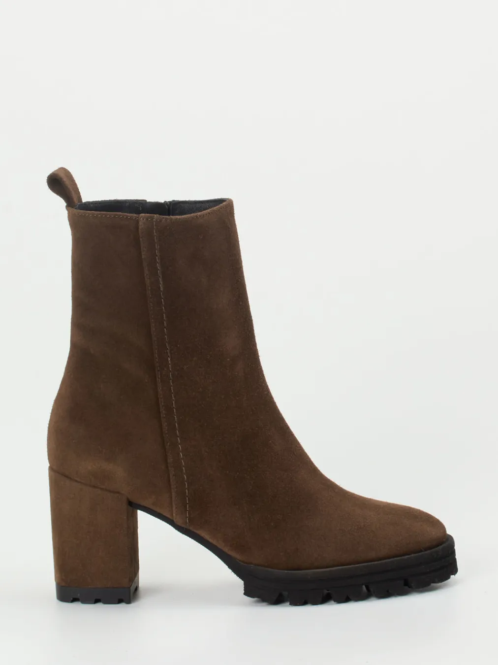 Chunky Chic mit zurückhaltender Eleganz.Konstantin Starke präsentiert zeitlose Damen-Stiefeletten in kaffeebraunem Veloursleder. Ob beim City-Walk oder im Office – das weich gearbeitete, matt strukturierte Obermaterial aus Veloursleder bietet Komfort und stilvolle Zurückhaltung zugleich. Die knöchelhohe Form mit rundem Leisten, schwarze Profilsohle und breitem Blockabsatz kombiniert feminine Eleganz mit urbaner Robustheit. Ton-in-Ton gehaltene Nähte, ein seitlicher Reißverschluss und eine feine Zuglasche runden das Konzept ab. Ideal zur weiten Stoffhose oder zum Strickkleid angesagter Naturtöne. Ein stilvoller Begleiter für Herbsttage mit dem gewissen modischen Anspruch.