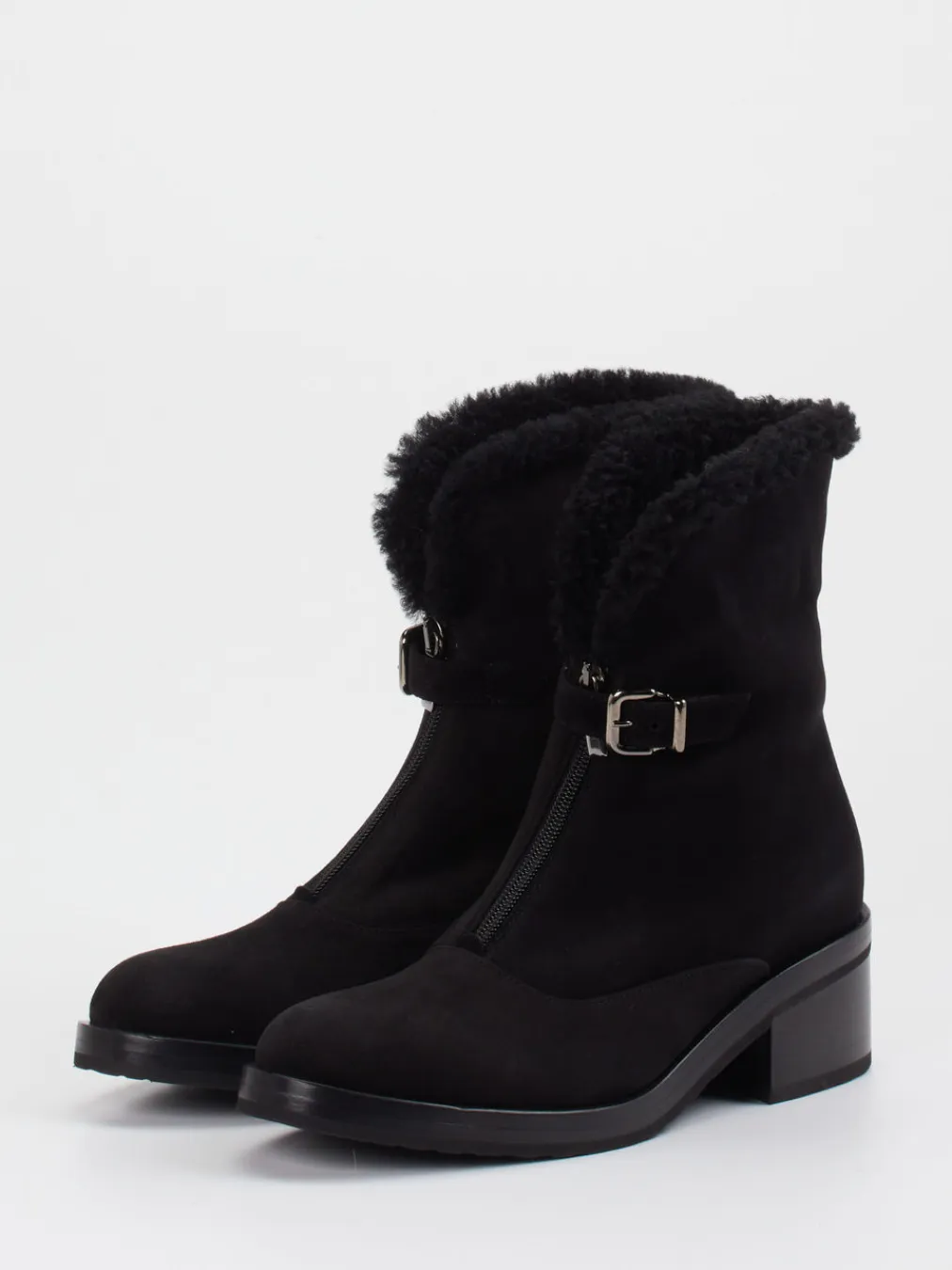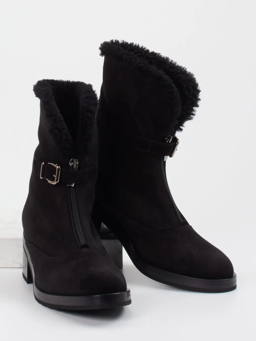 Wärme trifft auf minimalistisches Design.Truman’s präsentiert elegante Damen-Stiefeletten für Herbst und Winter. Wenn Komfort an kalten Tagen zählt, überzeugen diese Stiefeletten aus schwarzem Veloursleder mit samtiger Oberfläche und kuscheligem Lammfellfutter. Die klassische, robuste Silhouette erhält durch den markanten Frontreißverschluss und die silberfarbene Zierschnalle moderne Funktionalität. Dank profilierter Gummisohle, 5,5 cm hohem Absatz und dezentem Plateau bieten sie sicheren Halt und eine ansprechende Optik. Inspiriert vom Utility-Trend passen sie zu Steppmantel und Thermo-Leggings. Verlässlicher Style mit luxuriösem Tragekomfort – Truman’s vereint Handwerk und Funktionalität.