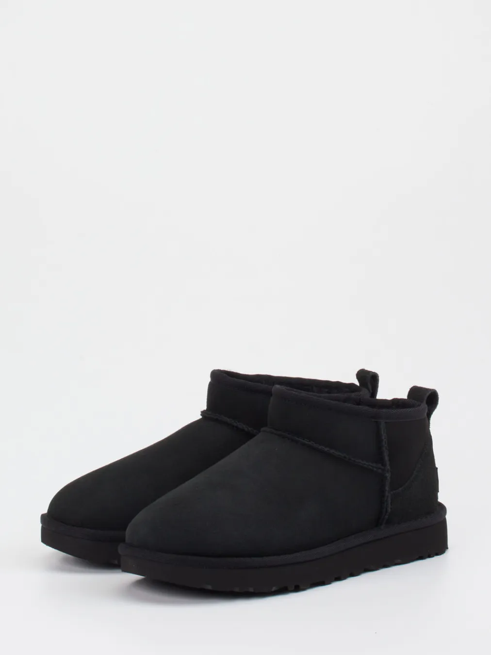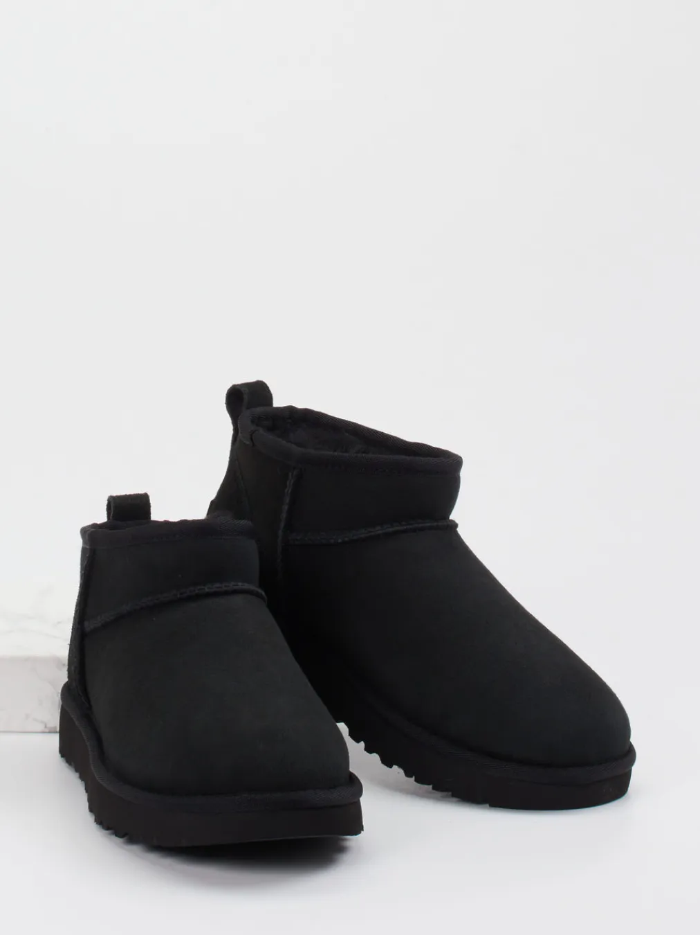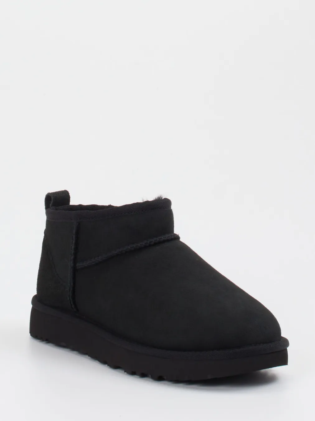 Gefertigt aus samtig-mattem Veloursleder in tiefem Schwarz und vollständig mit echtem Lammfell gefüttert, überzeugt das Modell durch seine rund-kompakte Form und klar strukturierte Ton-in-Ton-Nähte. Die Zuglasche am Schaft und die robuste, leicht profilierte Gummisohle unterstreichen die komfortbetonte Streetwear-Optik. Dezente Logo-Prägung sowie textile Einfassungen hauchen minimalistischer Mode subtil Charakter ein. Ideal kombinierbar mit Thermo-Leggings oder Oversized-Westen.