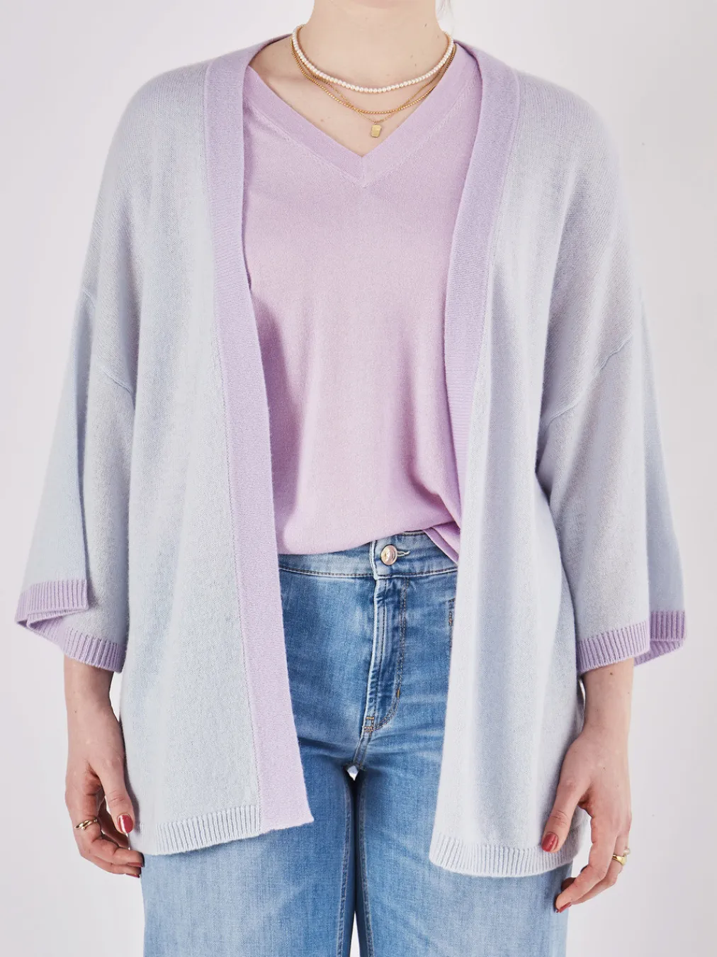 Die fliederfarbene Kaschmirstrickjacke von FLONA verbindet luxuriöse Weichheit mit einem modernen, kastigen Schnitt im Scandi-Stil.