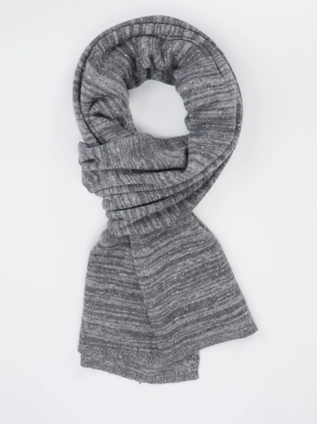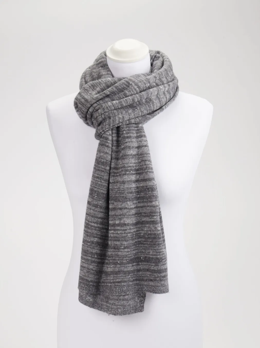 Der graue Strickschal setzt auf einen minimalistischen Look mit dezentem Glanz. Ideal für stilvolle Winter-Outfits von Alltag bis Büro.