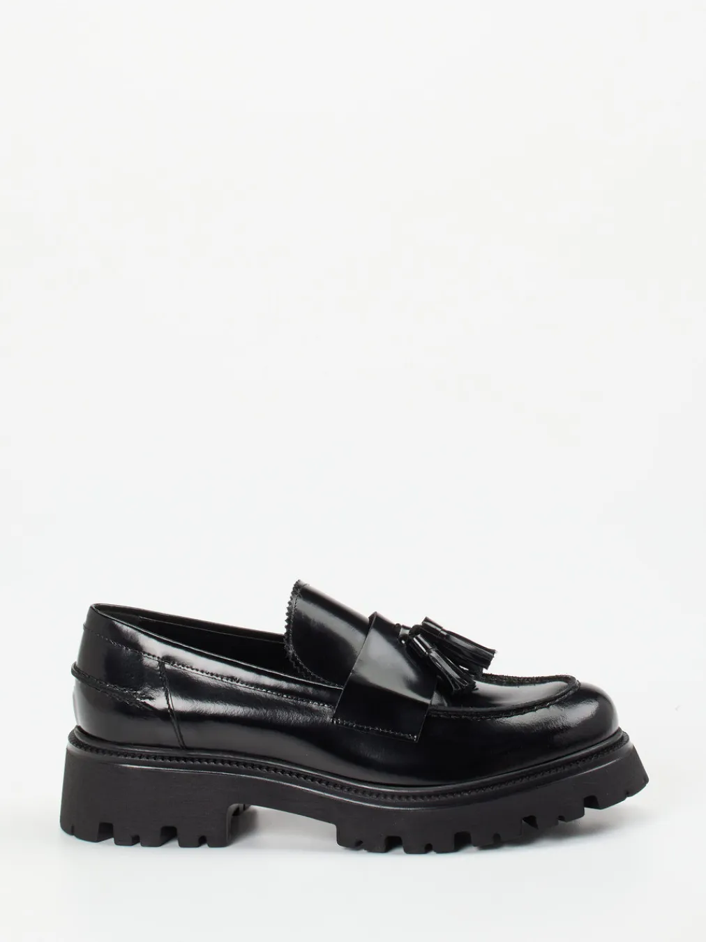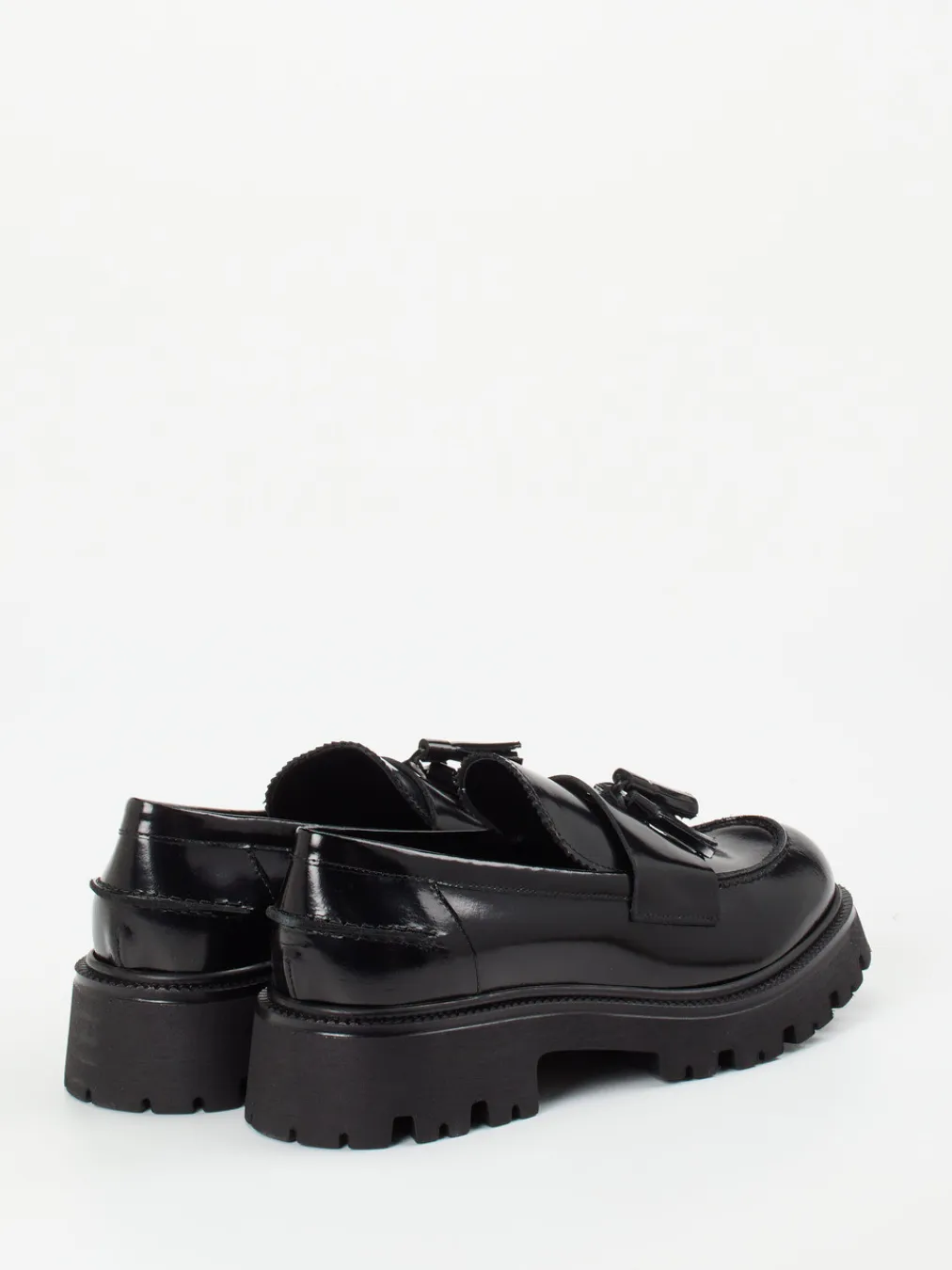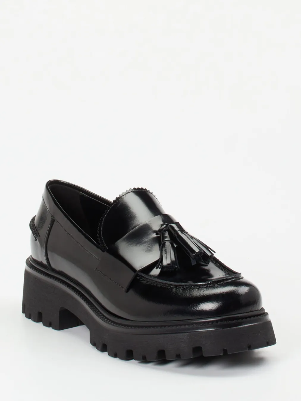 Klassisch und modern zugleich: Der Loafer aus schwarzem Hochglanzleder verbindet elegante Preppy-Ästhetik mit dem Trend der Chunky-Sohle.