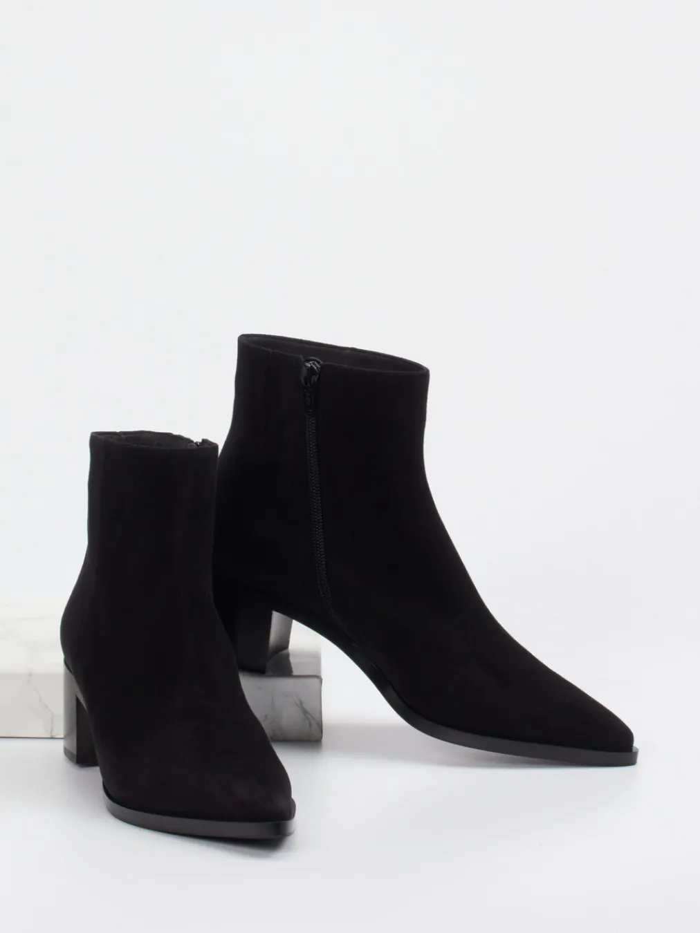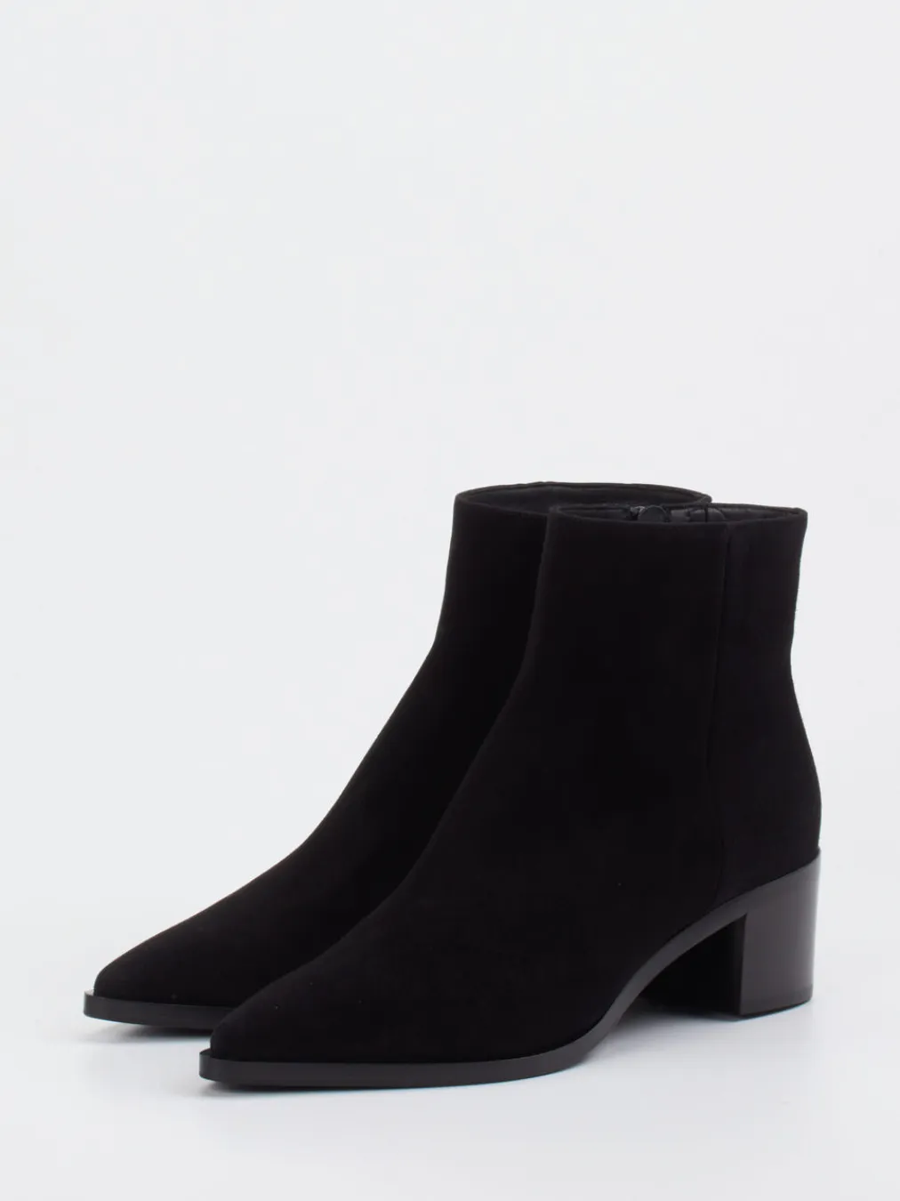 Puristische Eleganz mit hochwertigem Finish: Diese Ankle Boots aus schwarzem Veloursleder kombinieren zeitlose Formgebung mit dezenter Modernität.