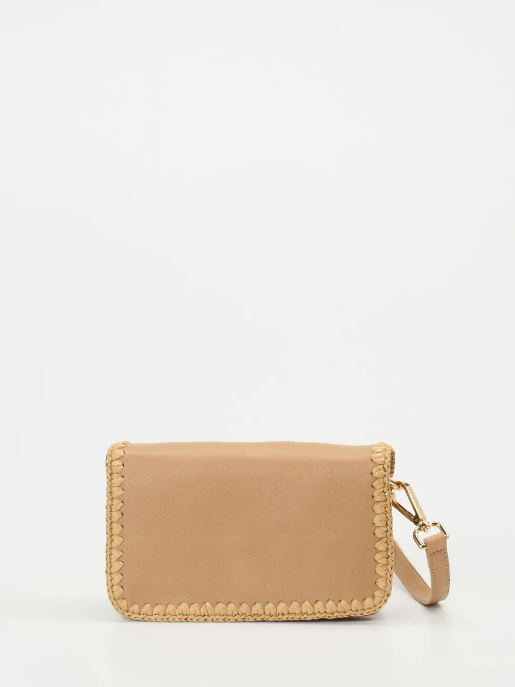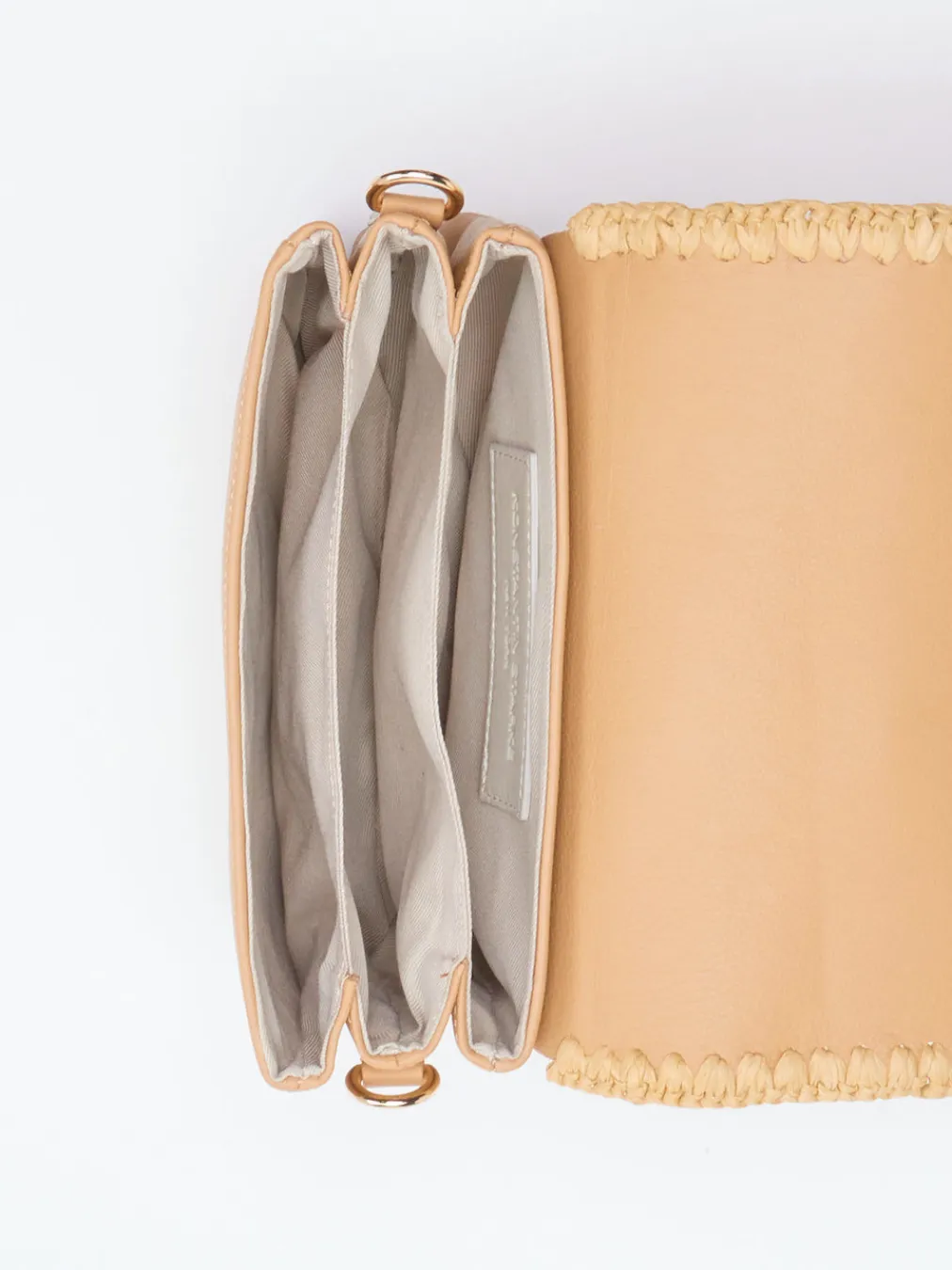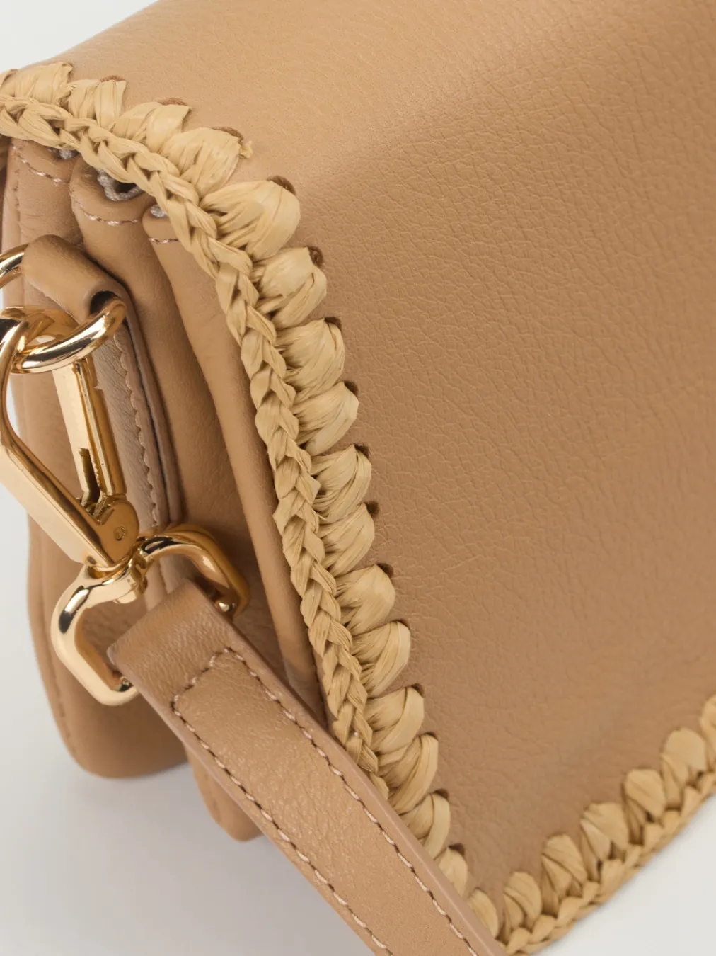 Die hellbraune Schultertasche aus hochwertigem Lammleder vereint klare Linien mit natürlichen Bastdetails – ein Statement für moderne Raffinesse.