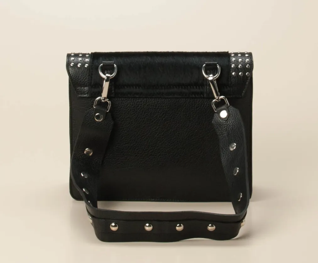 Mit strukturiertem Kalbleder, Ponyfell-Besatz und silberfarbenen Nieten vereint diese Crossbody Bag stilvolle Eleganz mit rockigem Charme. Perfekt für trendorientierte Alltags- und Party-Outfits.