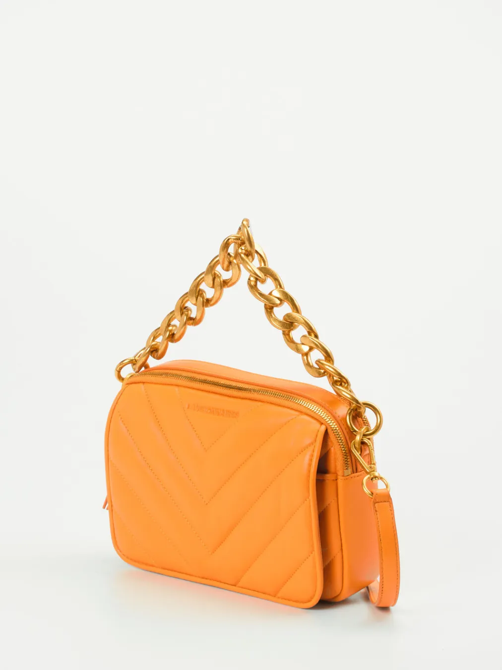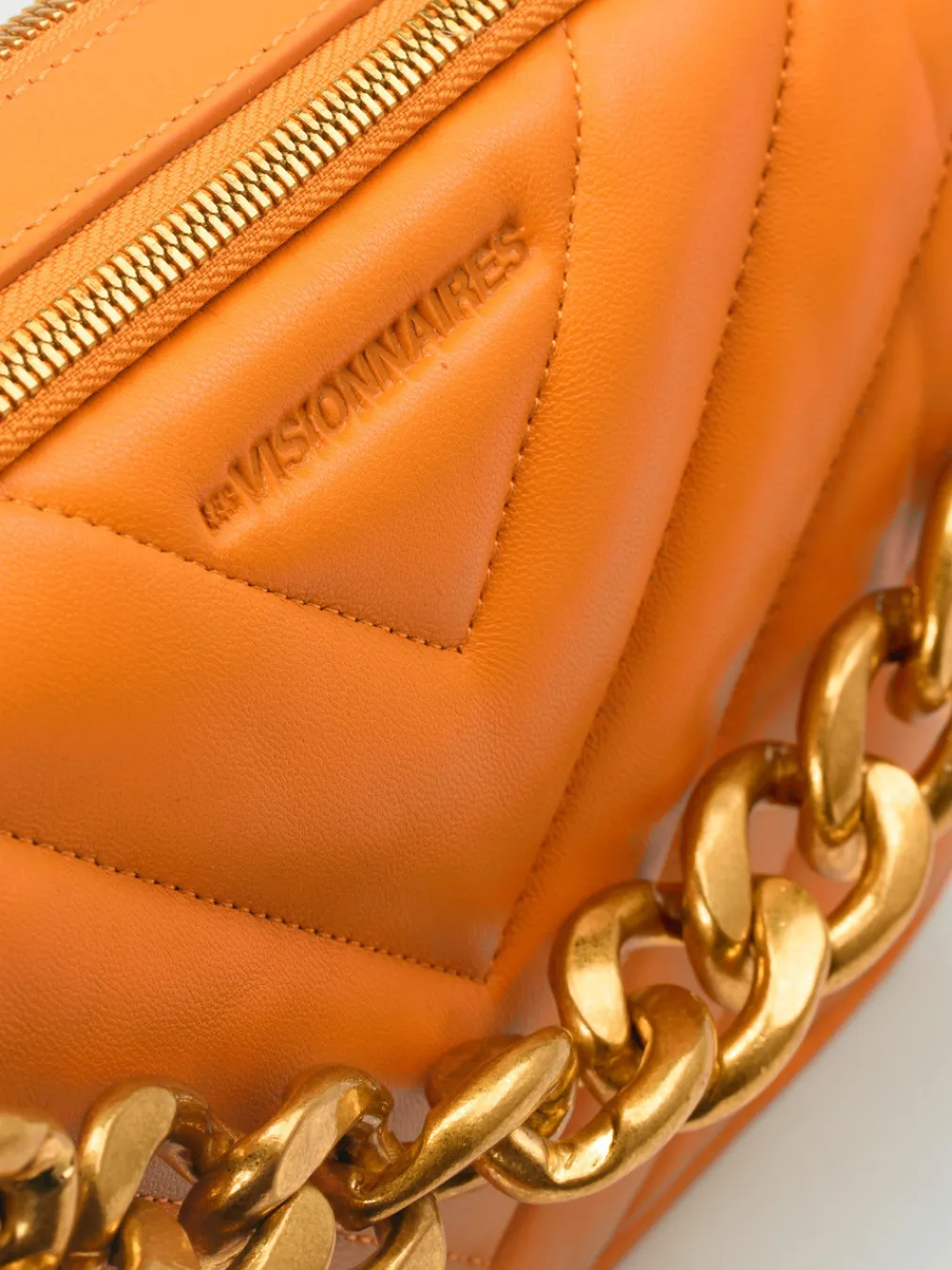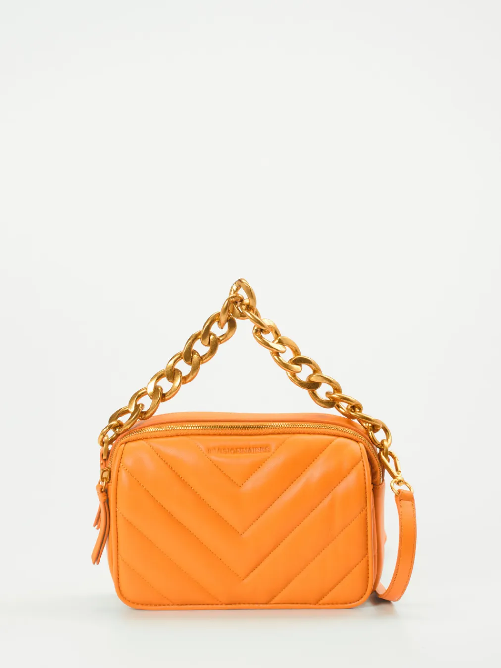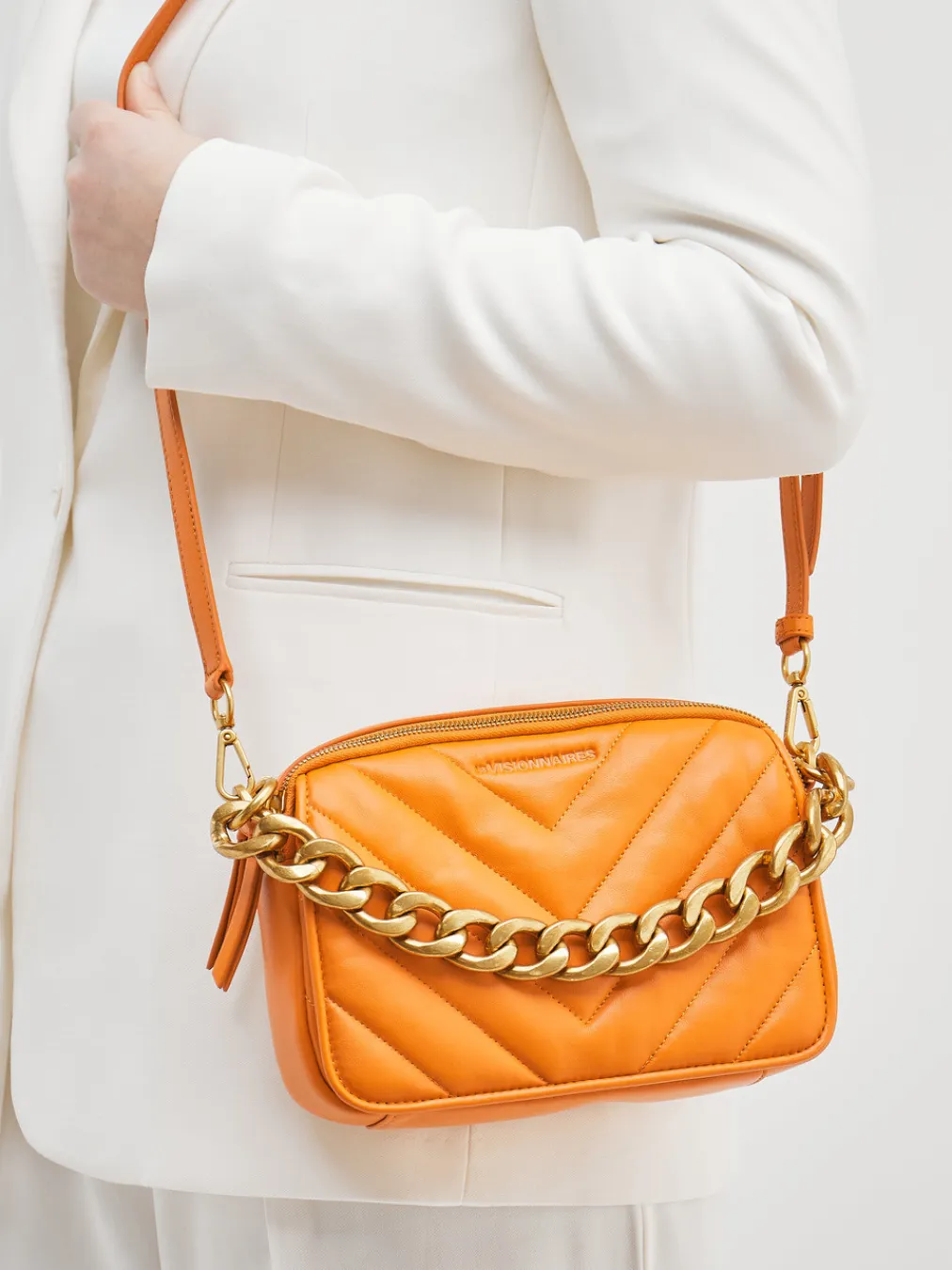Ein schickes Accessoire ist diese kleine Umhängetasche der Marke Les Visionnaires. Das orange Lammleder wird durch Steppnähte wunderbar in Szene gesetzt. Ein besonderes Augenmerk ist der goldfarbene Henkel in Form einer Kette, welcher durch einen Schulterriemen aus Lammleder ersetzt werden kann. Die zwei Reißverschlussfächer und das Frontfach mit dem Druckknopf bieten ausreichend Platz für ihre Wertsachen. Mit dieser Tasche sind Sie in der neuen Saison besonders stylish unterwegs! – Obermaterial: Lammleder – Futter: recyceltes Polyester – Farbe: Orange – Größe: ca. 16 x 23 x 5 cm (H x B x T) – Henkel: ca. 10 cm – Schulterriemen: 100 cm, verstellbar – Innen: sechs Steckfächer – Verschluss: Druckknopf, Reißverschluss