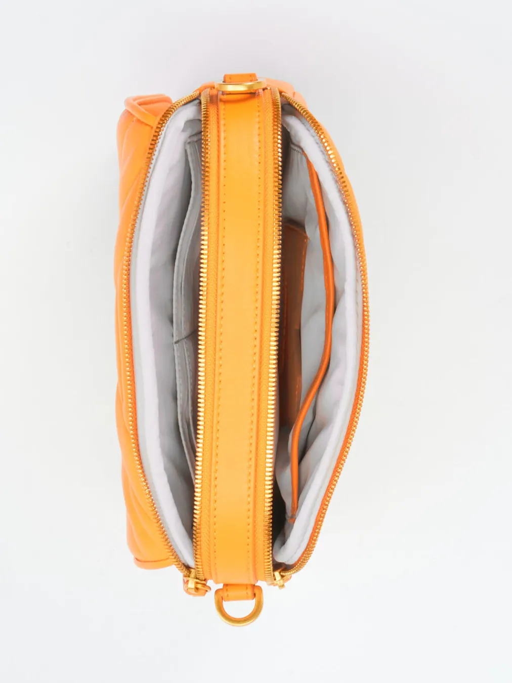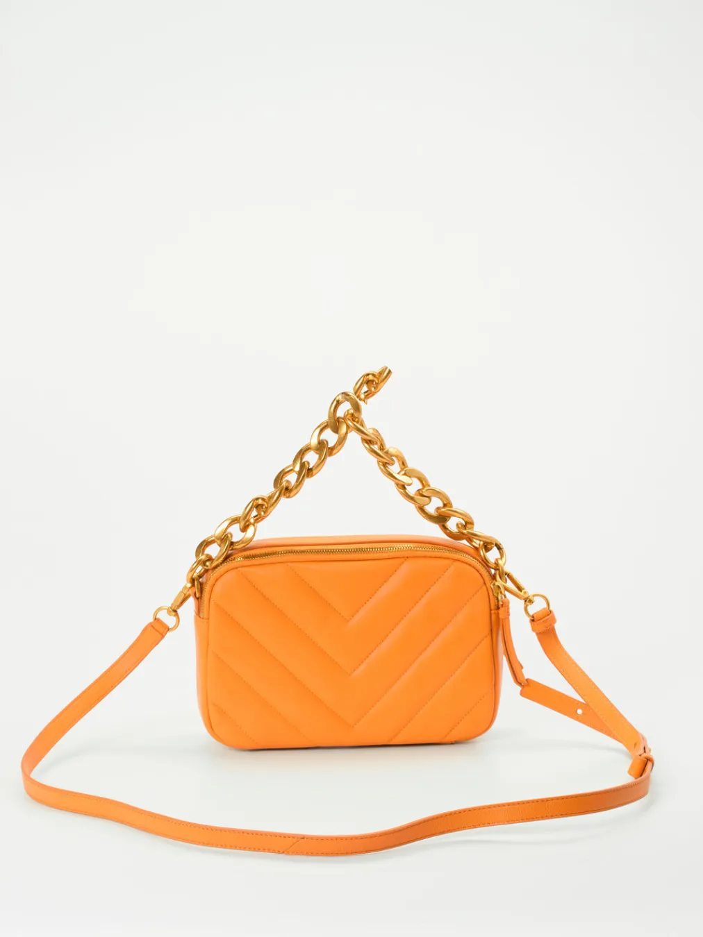 Leuchtendes Orange und goldene Details machen diese Crossbody Bag zum Statement-Piece. Hochwertiges Lammleder, praktische Fächeranordnung und zwei Tragevarianten runden das Design stilvoll ab.