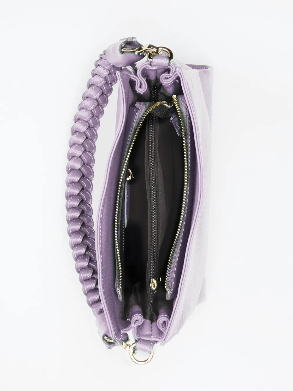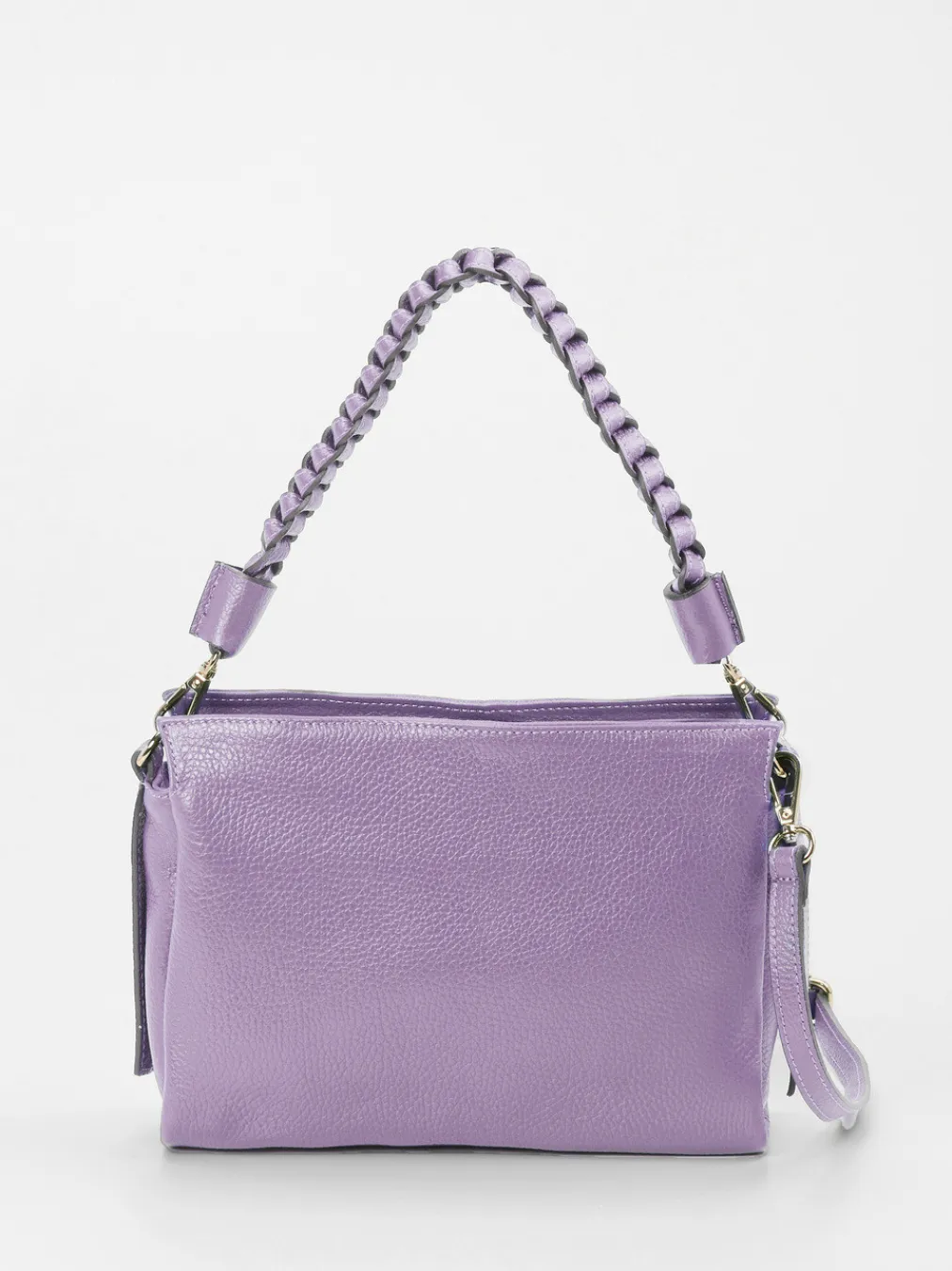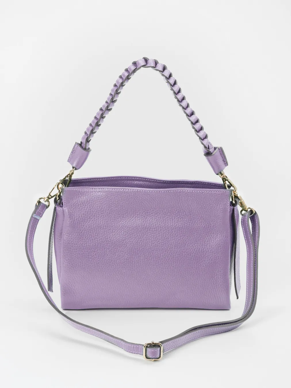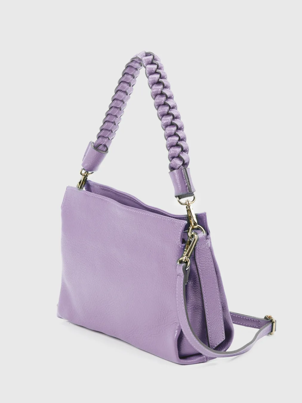 Die handgefertigte Schultertasche in zartem Fliederton vereint modernes Design mit funktionalen Details wie zwei Tragemöglichkeiten und goldfarbener Hardware.