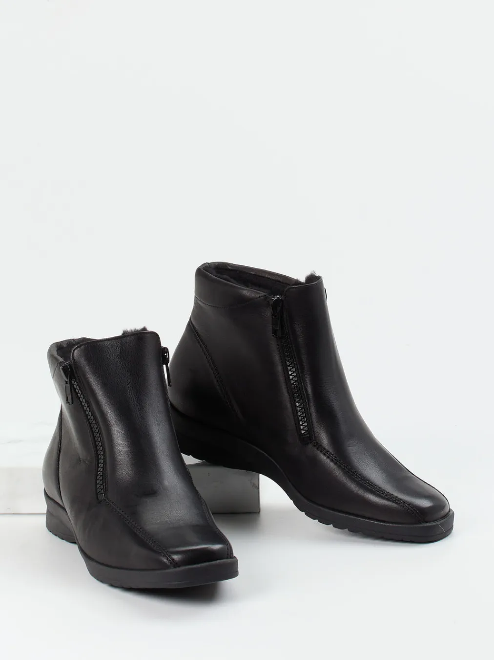 Stilvoll durch kalte Tage.Die Marke Semler zeigt mit dieser Damen-Stiefelette eine gelungene Kombination aus Funktion und Schlichtheit. Wenn Temperaturen fallen, bietet diese warm gefütterte Stiefelette aus schwarzem Kalbleder mit matter Oberfläche zuverlässigen Komfort. Das weiche Weblamm-Innenfutter hält angenehm warm, die beidseitigen Reißverschlüsse erleichtern den Einstieg. Die klassisch-knöchelhohe Form mit leicht eckiger Zehenpartie und Ton-in-Ton-Nähten verleiht eine dezente Silhouette. Durch die griffige Gummisohle garantiert das Modell Trittsicherheit – perfekt für winterliche Alltagswege. Der Look passt wunderbar zu Thermohosen oder wärmenden Mänteln. Komfort trifft Minimalismus – bequem gebettet im Slow-Fashion-Stil von Semler.