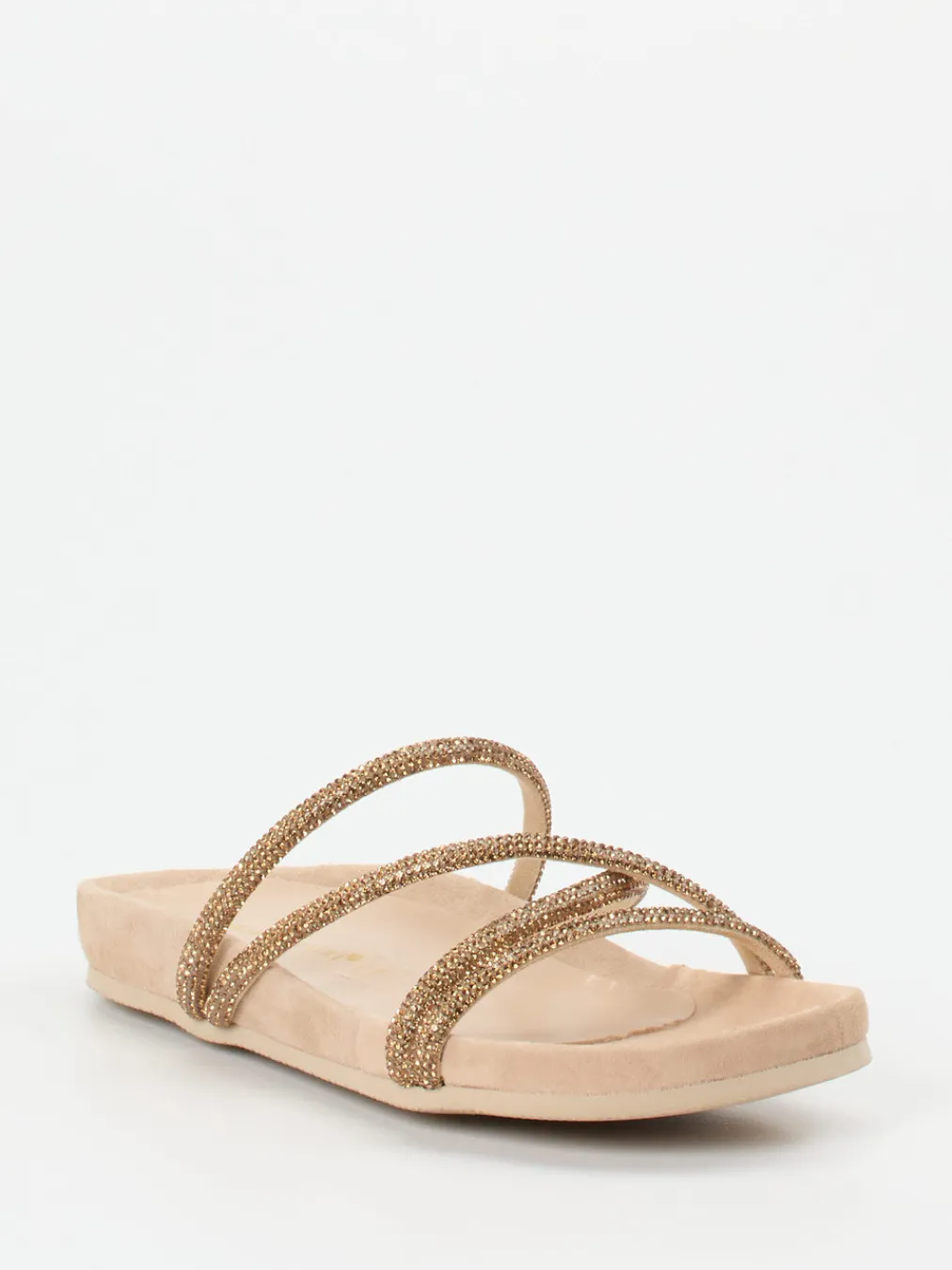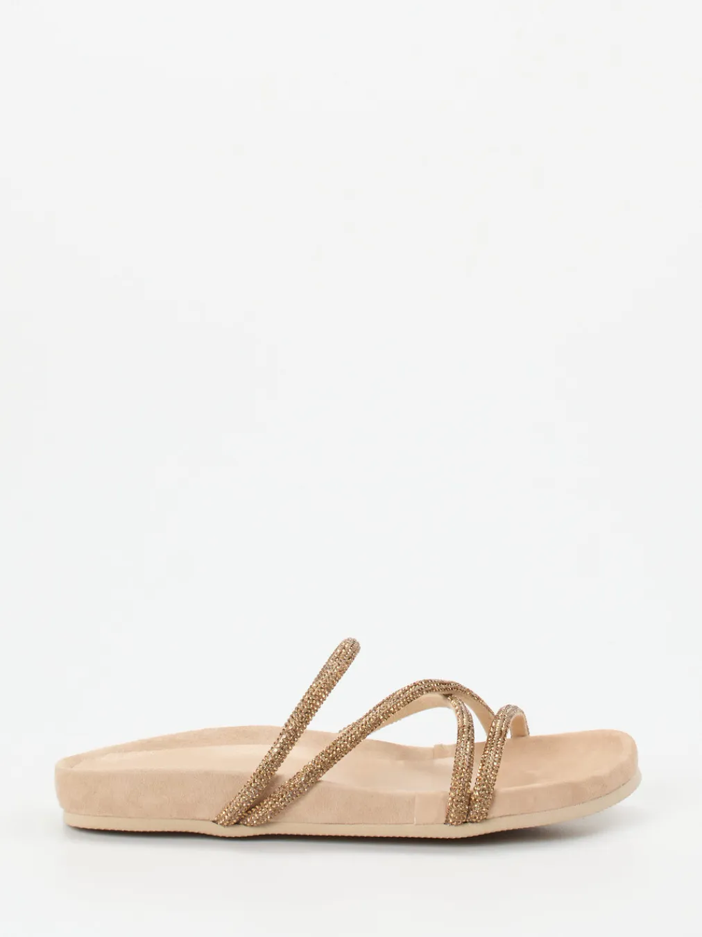 Die Kombination aus filigranem Metallicleder, tonigen Strassdetails und anatomisch geformtem Fußbett sorgt für Glamour und Komfort an warmen Tagen. Ideal für trendorientierte Sommer-Looks.