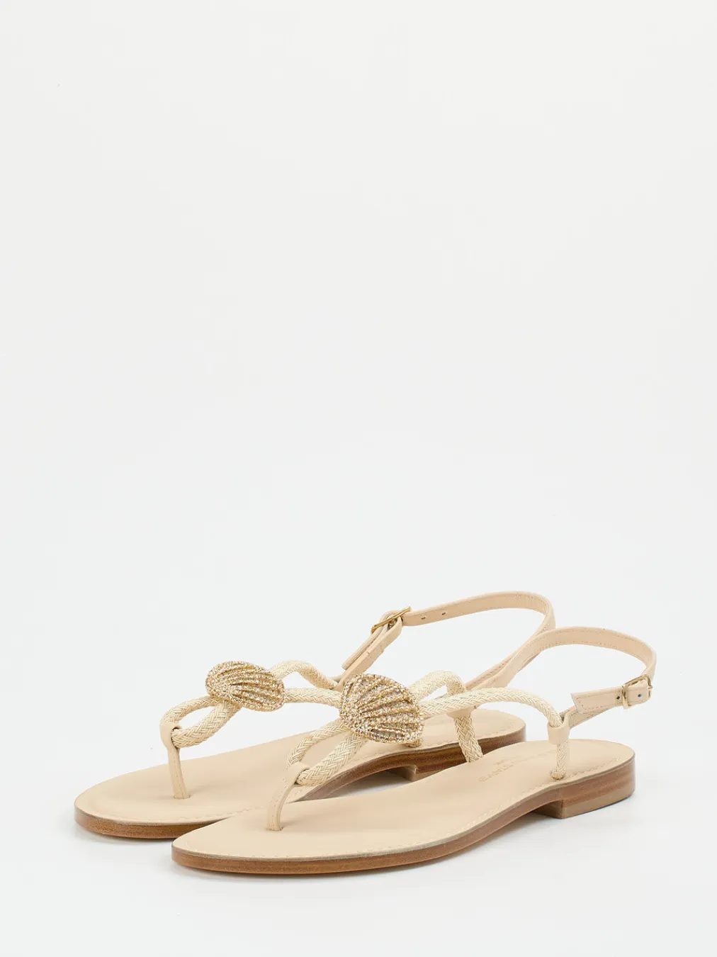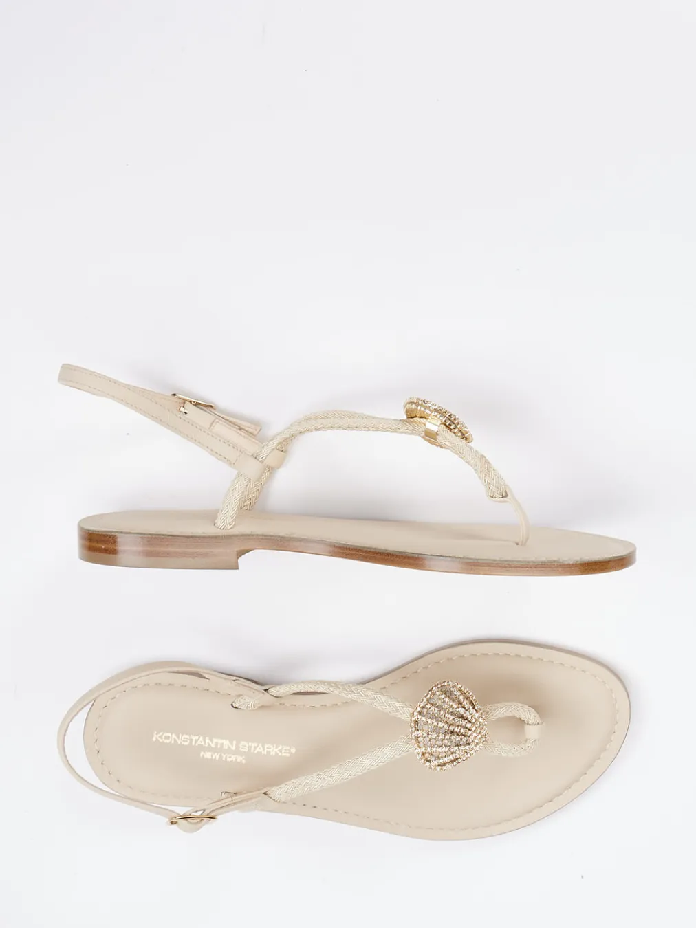Sommer mit Stilgefühl.Die Damen-Zehentrenner von Konstantin Starke vereinen feinstes Textil mit glattlederner Ledersohle und edler Note. Ob beim Stadtbummel an warmen Tagen oder am Strand – das Modell erfüllt den Wunsch nach luftigem Tragekomfort mit stilvoller Ausstrahlung. Die beige Farbgebung und flache, offene Silhouette betonen den minimalistischen Charakter. Feine Zierflechtungen, goldfarbene Schmuckelemente in Muschelform und eine verstellbare Dornschließe unterstreichen den Boho-inspirierten „Coastal Chic“-Look. In Kombination mit einem Sommerkleid oder Leinenhose entsteht ein harmonisches Outfit für entspannte Momente. Hochwertige Verarbeitung trifft auf trendbewusste Details aus dem Haus Konstantin Starke.