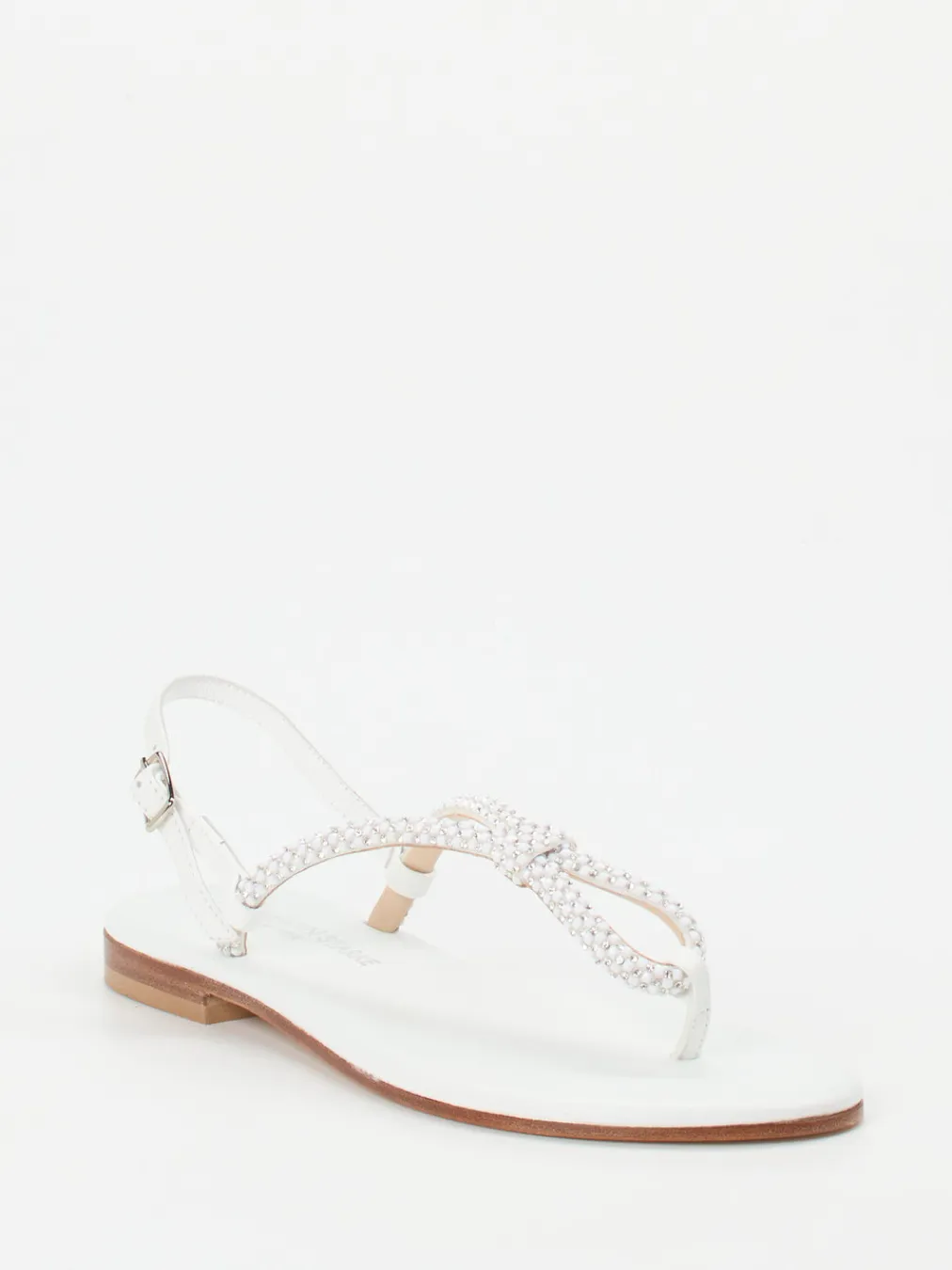 Filigran verarbeitete Zehentrenner-Sandale mit glänzendem Finish und zeitloser Strassverzierung – ein stilvoller Akzent für festliche Sommermomente.