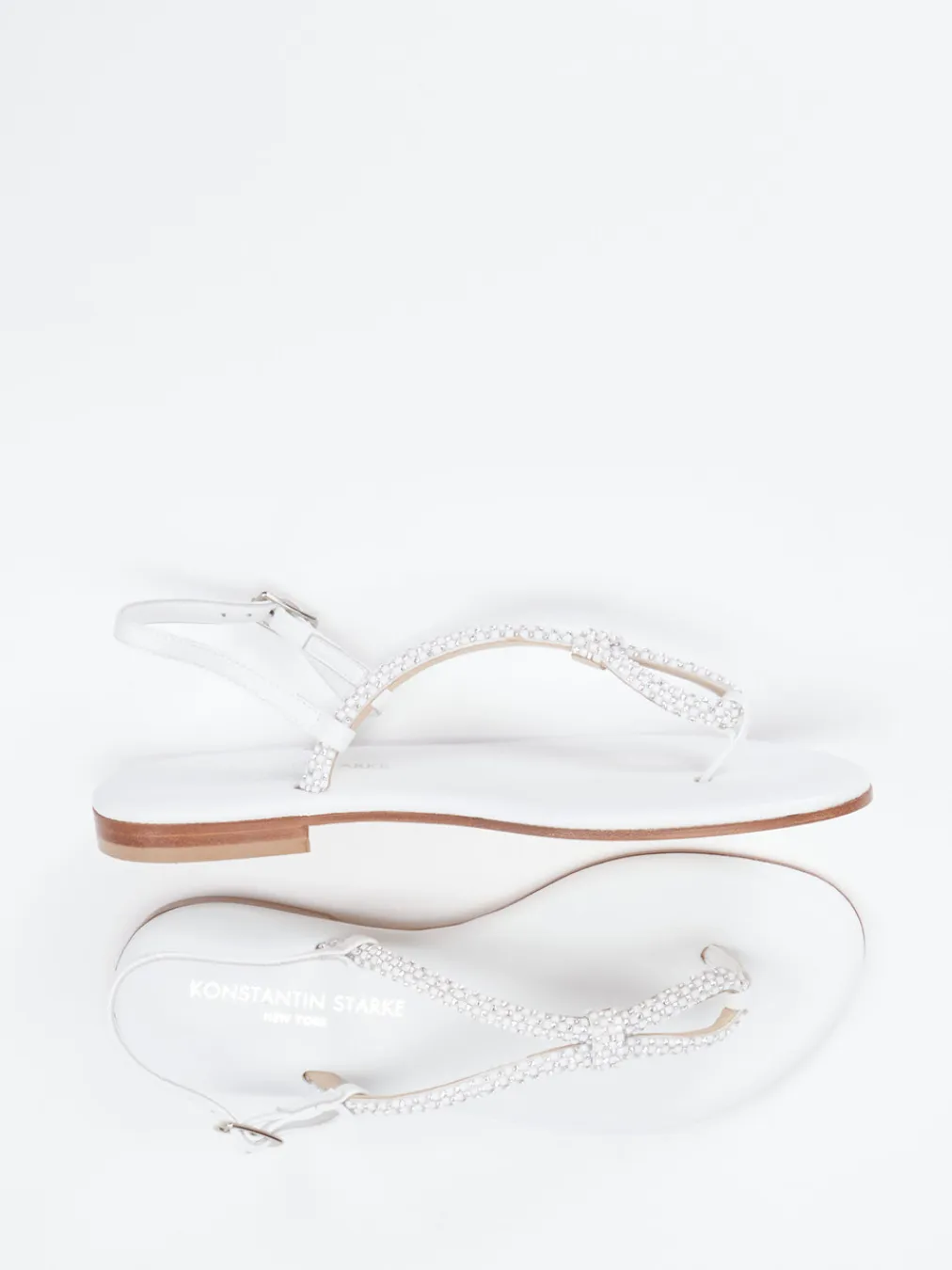 Sommerlich glänzende Leichtigkeit.Konstantin Starke interpretiert die klassische Zehentrenner-Sandale mit eleganter Strahlkraft. Für sommerliche Events oder exklusive Strandtage konzipiert, verbindet dieses Modell hochwertiges Glattleder mit schimmernder Strassverzierung auf weißem Grund. Die offene, flache Silhouette sowie ein verstellbarer Fersenriemen mit silberfarbener Dornschließe sorgen für Leichtigkeit und Halt. Besondere Akzente setzen der dezente Glanz des Leders und die schlanke Linienführung. Die Lederlaufsohle unterstreicht die wertige Verarbeitung. Perfekt harmonierend mit Leinenlooks in Naturtönen oder Metallic-Accessoires. Zeitlose Ästhetik trifft auf dezente Opulenz im Zeichen von „Quiet Luxury“.