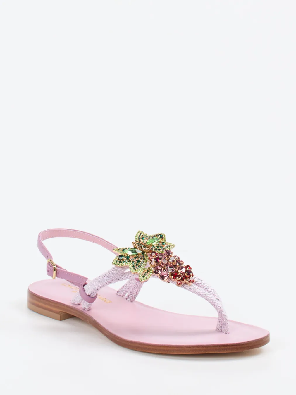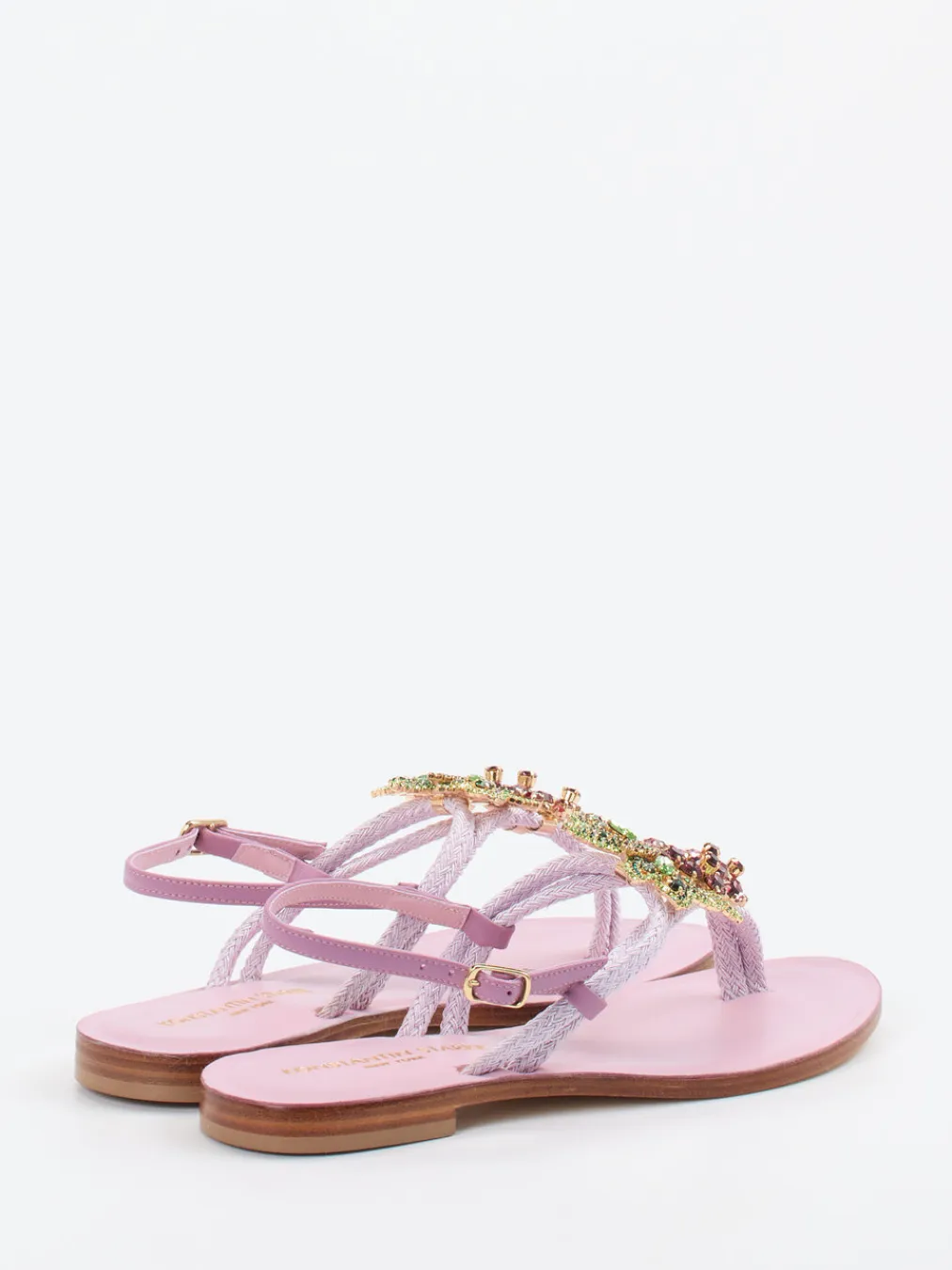 Die Kombination aus geflochtenem Textilriemen, zartem Fliederleder und floraler Kristallverzierung verleiht dieser Sandale stilvolle Raffinesse und sommerliche Leichtigkeit.